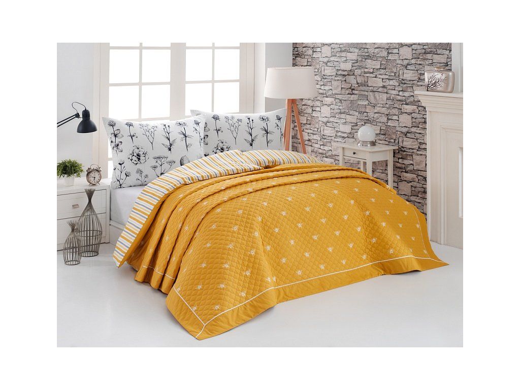 Die Tagesdecke Adore ist ein einzigartiges ästhetisches und praktisches Accessoire, mit dem das Bett immer perfekt gemacht ist. Als Füllung wird geschichtetes Hohlfaser verwendet, das Obermaterial besteht aus 100% Baumwollstoff in demselben Design wie die Bettwäsche. Über die gesamte Fläche ist eine dekorative Steppung angebracht, um die Stabilität der Füllung zu gewährleisten und gleichzeitig das Gesamtbild der Tagesdecke zu betonen. Farbausführung: Kombination aus honiggelb, hellgelb, hellgrau und weiß, die Oberseite der Tagesdecke entspricht dem Foto, die Unterseite ist gestreift, die Tagesdecke ist mit farblich abgestimmter Paspelierung versehen. Pflege: Die Tagesdecken können bei 40 °C in der Waschmaschine gewaschen werden.Zusätzliche Parameter