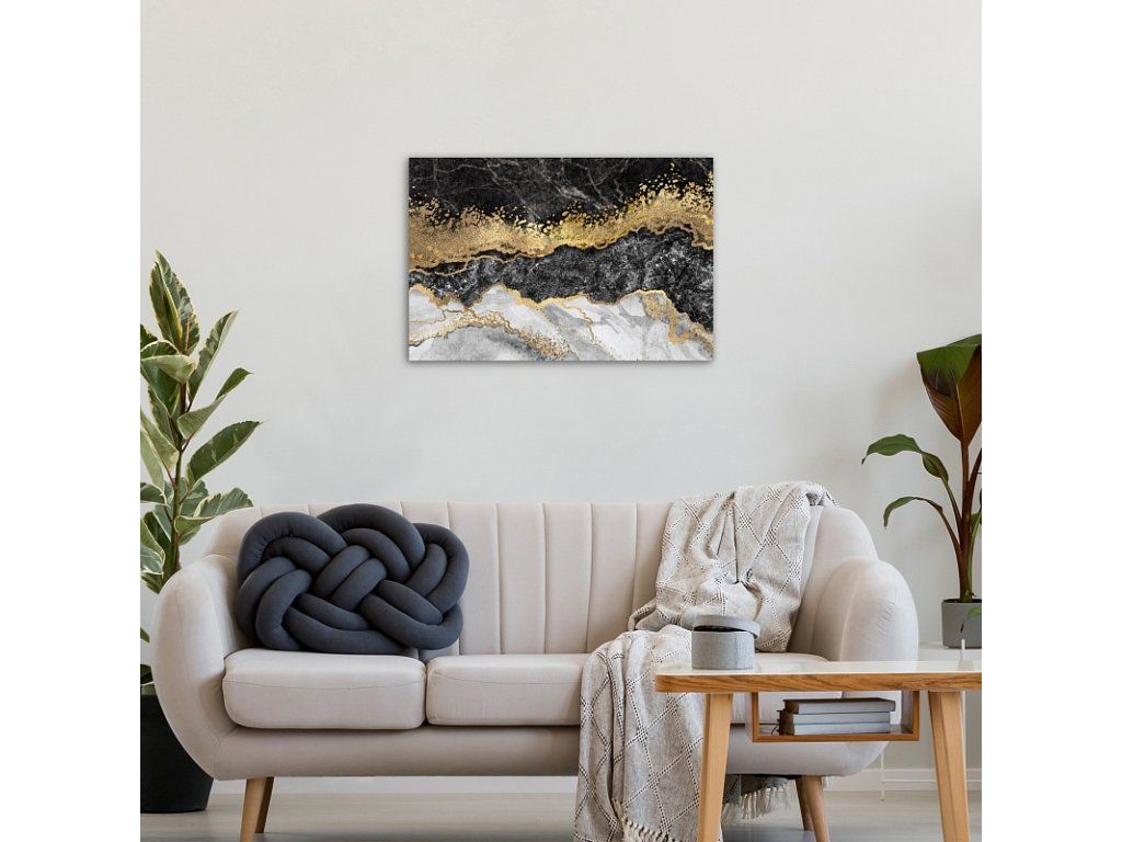Verleihen Sie Ihrem Interieur eine außergewöhnliche Atmosphäre mit dem Gemälde Gold Marble. Das Muster des Gemäldes ist auf hochwertiger Baumwollleinwand mit unregelmäßiger Struktur Canvas PowerSol Satin gedruckt. Die Oberfläche ist reißfest und verleiht der Leinwand zudem ein samtiges Aussehen. Das Gemälde wird bereits auf einem Holzrahmen gespannt geliefert und ist mit einer Aufhängung für die Wandmontage versehen. Produkte mit demselben Motiv können aufgrund unterschiedlicher Drucktechnologien leichte Farbabweichungen aufweisen.Zusätzliche Parameter