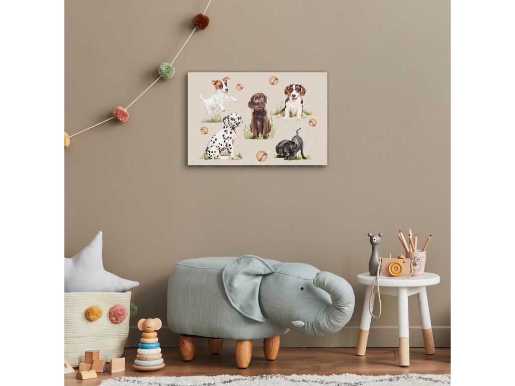 Verleihen Sie Ihrem Interieur eine außergewöhnliche Atmosphäre mit dem Gemälde "Hunde". Das Gemälde ist auf hochwertiger Baumwollleinwand mit unregelmäßiger Struktur Canwas PowerSol Satin gedruckt. Die Oberfläche ist reißfest und verleiht der Leinwand zudem ein samtiges Aussehen. Das Gemälde wird bereits auf einem Holzrahmen gespannt geliefert und ist mit einer Aufhängung für die Wandmontage versehen. Produkte mit demselben Motiv können aufgrund unterschiedlicher Drucktechnologien geringfügige Farbabweichungen aufweisen.Zusätzliche Parameter