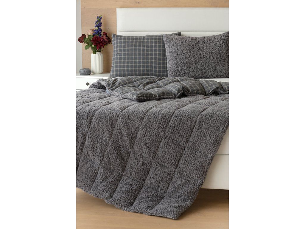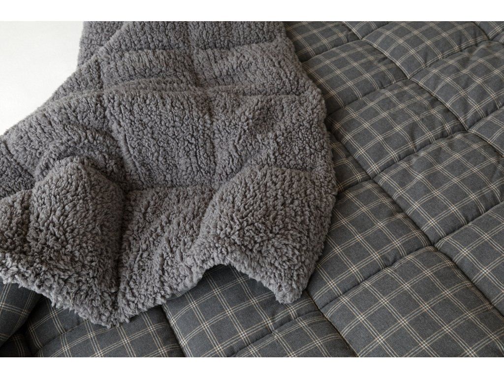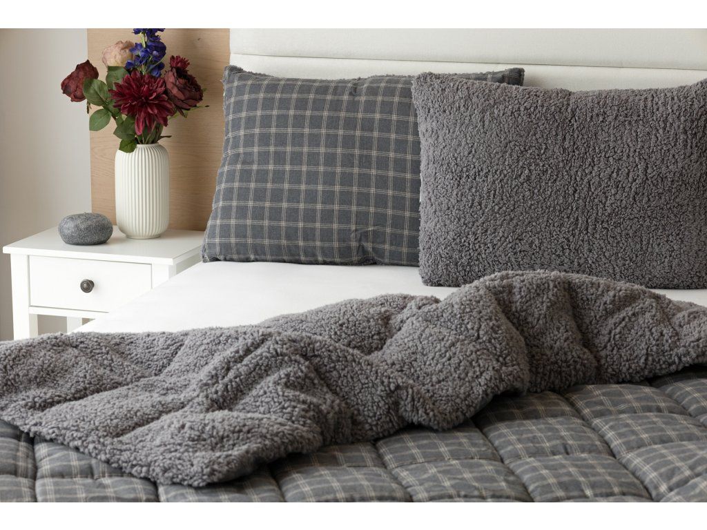 Glück bevorzugt die Vorbereiteten! Lassen Sie sich nicht vom kalten Wetter überraschen und gönnen Sie sich eine wohlverdiente Erholung in der Wärme... Die neue Kollektion gesteppter Flanelldecken mit Lammfell bietet Ihnen ein einzigartiges Wärmegefühl und erstaunlichen Komfort an regnerischen Tagen, kühlen Abenden und Winternächten. Die Oberseite der gesteppten Decke besteht aus weichem Flanell mit feiner Florstruktur, die Unterseite ist mit warmem flauschigem Lammfell bedeckt. Die innere Füllung mit einer Flächengewicht von 250 g/m2 besteht aus mikrogelöstem Polyester-Nanofaser, das atmungsaktiv, leicht und nicht verklumpt ist. Die Stabilität der Füllung wird durch präzises Steppen über die gesamte Fläche gewährleistet. Das elegante Muster "Arno" mit feinen cremefarbenen Karos auf anthrazitgrauem Hintergrund wird durch farblich abgestimmtes dunkelgraues Lammfell ergänzt. Zu der Decke kann auch ein Kissen im gleichen Design erworben werden. Dank des geringen Gewichts können Sie diese praktischen Decken das ganze Jahr über nutzen. In kälteren Zeiten kuscheln Sie sich in das weiche Lammfell, das eine ausgezeichnete Wärmeisolierung bietet, in wärmeren Monaten drehen Sie die Decke einfach um. Materialzusammensetzung: Oberseite: Mischung aus recycelter Baumwolle und Polyester Unterseite: 100% Polyester Füllung: 100% Polyester Pflege: Die Decke kann in einer ausreichend großen Waschmaschine bei 40°C gewaschen werden. Wir empfehlen auf jeden Fall nicht, sie im Trockner zu trocknen, jedoch trocknen die verwendeten Materialien sehr schnell. Die Kollektion von Lammfell-Bettwaren erfüllt die Kriterien der internationalen Zertifizierung Oeko-Tex Standard 100.Zusätzliche Parameter