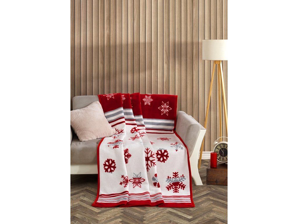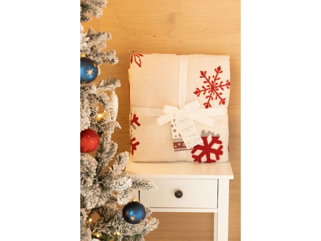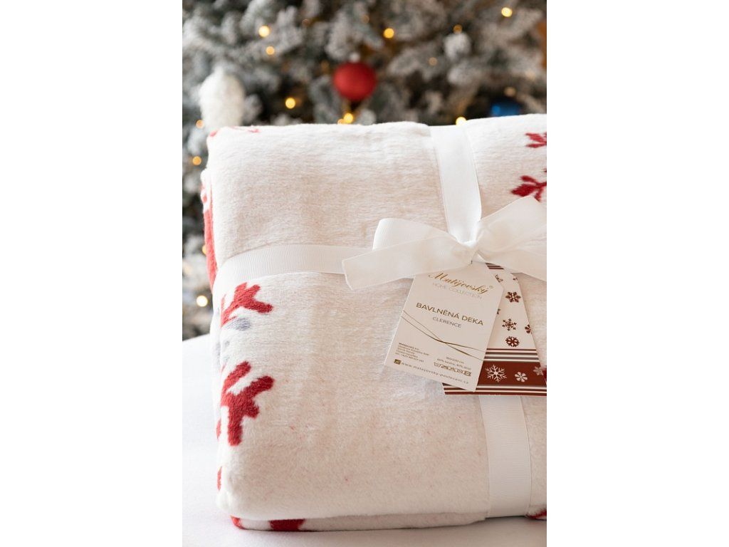 Luxuriöse Baumwolldecke mit dichtem Flor, warm und angenehm weich im Griff. Die neue Webrezeptur garantiert Leichtigkeit und hervorragende Atmungsaktivität. Die Decke Clerence wird zu einem einzigartigen Accessoire in Ihrem Zuhause und einem unverzichtbaren Begleiter für kühle Abende. Sie können die Decke auch elegant als dekorative Überwurf verwenden. Die Decke, die mit einer umgekehrten Farbgestaltung glänzt, ist rundum mit farblich abgestimmter Einfassung versehen. Design: Schneeflockenmotiv in Kombination aus cremeweiß, dunkelrot und hellgrau Materialzusammensetzung: 60 % Baumwolle, 40 % Acryl Maße: 160/220 cm Gewicht: 450 g/m2 Die Decke kann bei 30 °C mit einem milden Waschmittel gewaschen werden.Zusätzliche Parameter