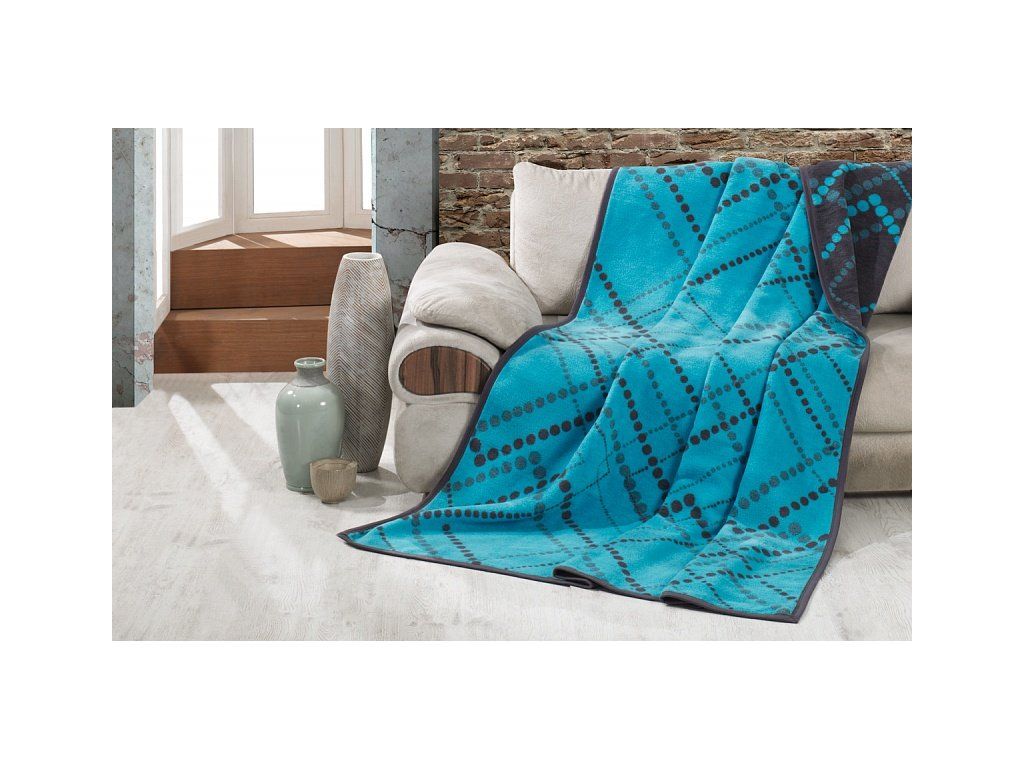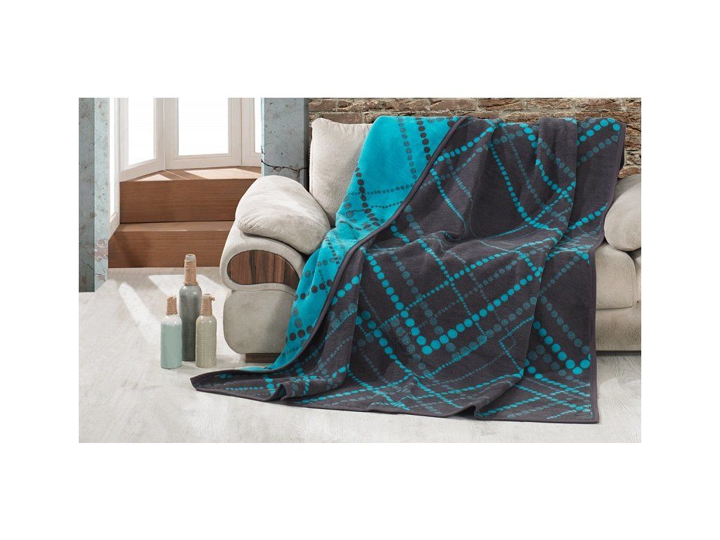 Luxuriöse Baumwolldecke mit dichtem Flor, warm und angenehm weich im Griff. Die neue Webrezeptur garantiert Leichtigkeit und hervorragende Atmungsaktivität. Die Decke Dexter wird zu einem einzigartigen Accessoire in Ihrem Zuhause und einem unverzichtbaren Begleiter für kühle Abende. Die Decke kann auch elegant als dekorative Überwurf genutzt werden. Die Decke, die mit einer umgekehrten Farbgebung glänzt, ist rundherum mit farblich abgestimmter Einfassung versehen. Design: frisches geometrisches Muster in den Farbkombinationen Anthrazit und Türkis. Materialzusammensetzung: 60 % Baumwolle, 40 % Acryl. Maße: 160/220 cm. Grammatur: 450 g/m2. Die Decke kann bei 30 °C mit einem milden Waschmittel gewaschen werden. Die Farbgebung der Decke kann aufgrund anderer Materialien und Drucktechnologien leicht von anderen Produkten mit dem gleichen Motiv abweichen.Zusätzliche Parameter