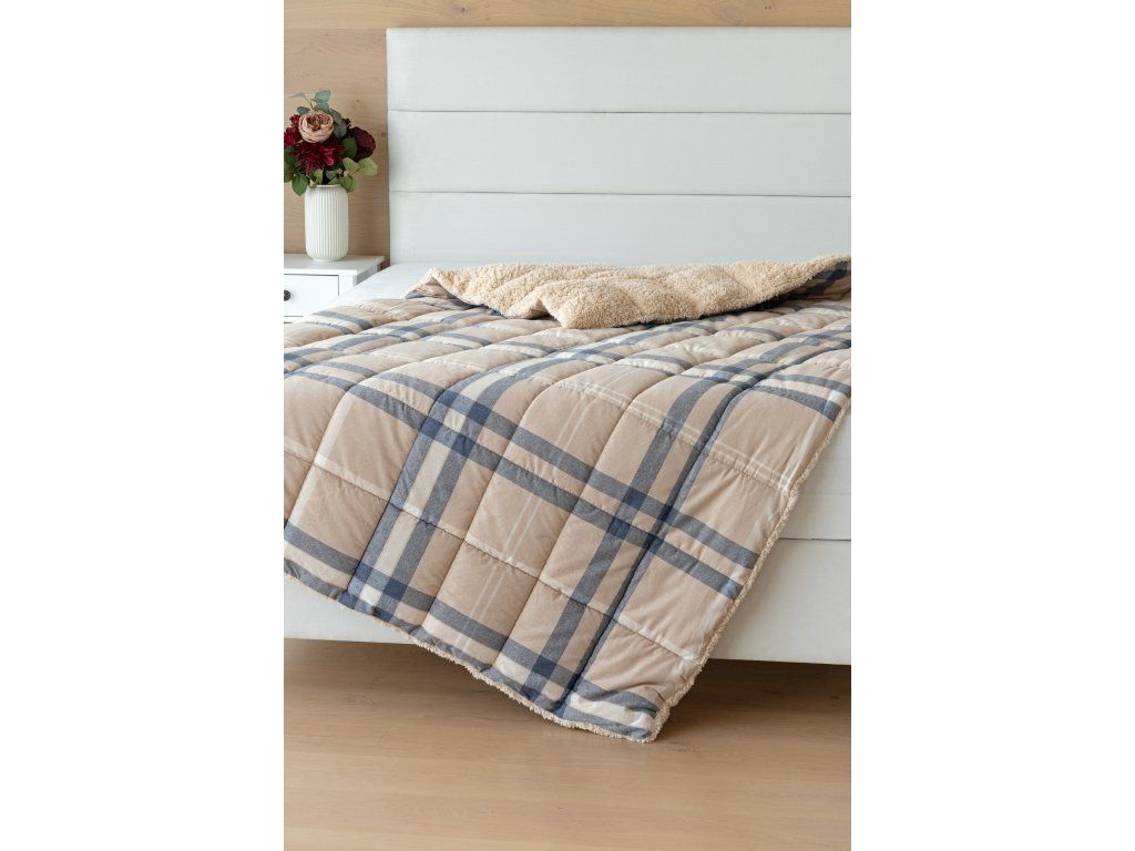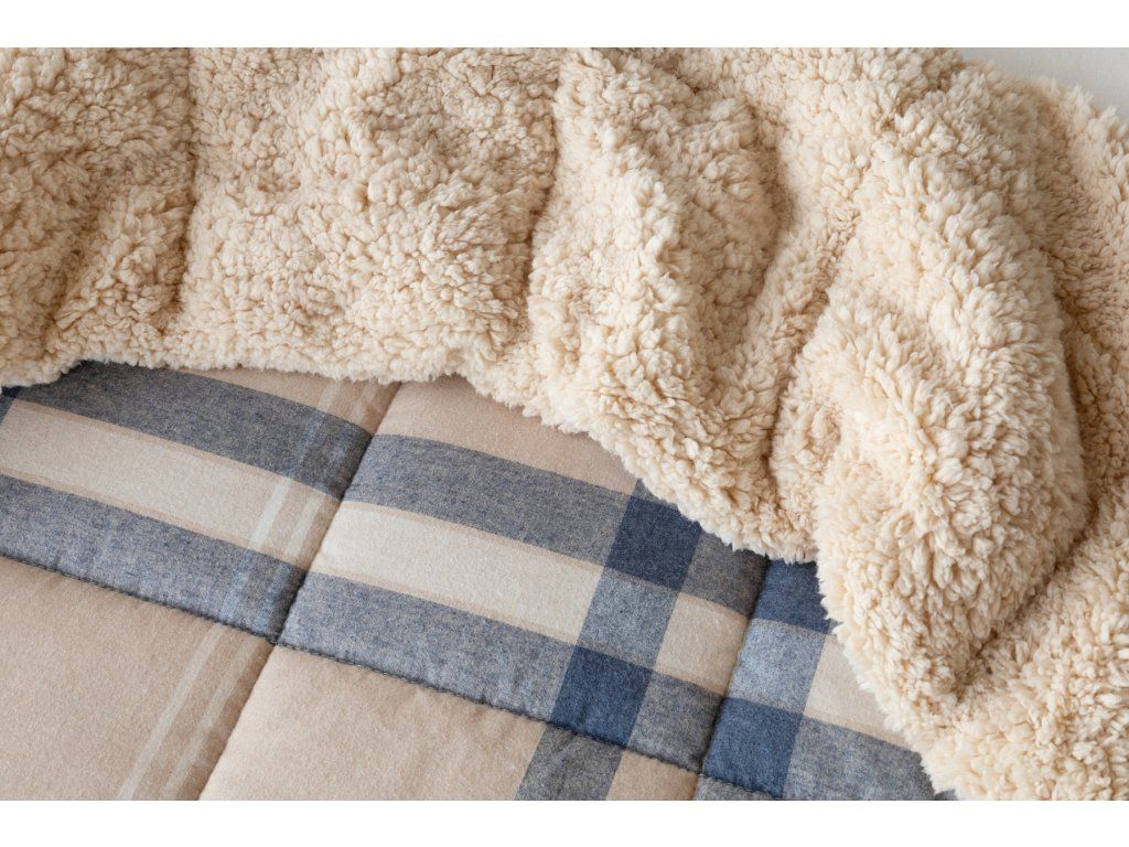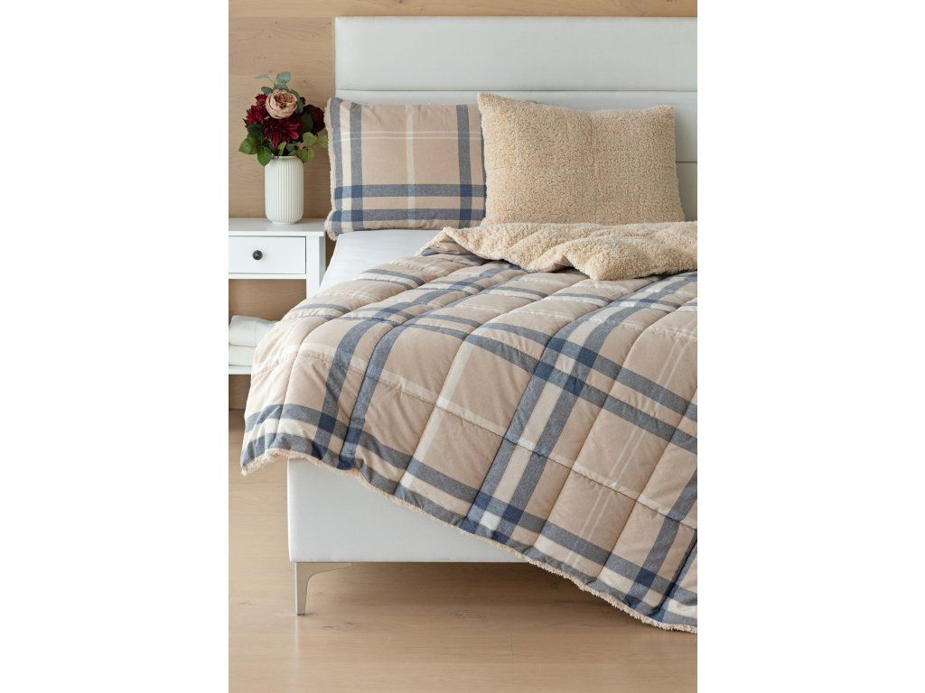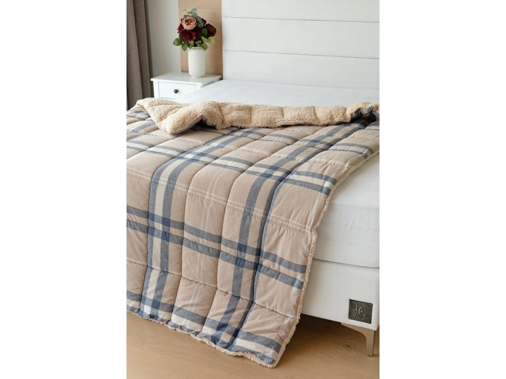 Glück bevorzugt die Vorbereiteten! Lassen Sie sich nicht vom kalten Wetter überraschen und gönnen Sie sich eine wohlverdiente Erholung in der Wärme... Die neue Kollektion gesteppter Flanelldecken mit Lamm bietet Ihnen ein einzigartiges Wärmegefühl und erstaunlichen Komfort an regnerischen Tagen, kalten Abenden und Winternächten. Die Oberseite der gesteppten Decke besteht aus weichem Flanell mit feinem Flor, die Unterseite ist mit warmem flauschigem Lamm bedeckt. Die innere Füllung mit einer Flächengewicht von 250 g/m2 besteht aus mikrogelartigem Polyester-Nanofasern, die atmungsaktiv, leicht und nicht verklumpend sind. Die Stabilität der Füllung wird durch präzises Quilten über die gesamte Fläche gewährleistet. Das attraktive karierte Muster Ella in Kombination mit Beige, Dunkelblau und Weiß ergänzt das farblich abgestimmte Lamm in Beige. Zu der Decke kann auch ein Kissen im selben Design erworben werden. Dank des geringen Gewichts können Sie diese praktischen Decken das ganze Jahr über nutzen. In kälteren Zeiten kuscheln Sie sich in das weiche Lamm, das eine ausgezeichnete Wärmeisolierung bietet, in wärmeren Monaten drehen Sie die Decke einfach um. Materialzusammensetzung: Oberseite: Mischung aus recycelter Baumwolle und Polyester Unterseite: 100% Polyester Füllung: 100% Polyester Pflege: Die Decke kann in einer ausreichend großen Waschmaschine bei 40°C gewaschen werden. Wir empfehlen auf jeden Fall kein Trocknen im Trockner, jedoch trocknen die verwendeten Materialien sehr schnell. Die Kollektion von Lamm-Bettwäsche erfüllt die Kriterien der internationalen Zertifizierung Oeko-Tex Standard 100.Zusätzliche Parameter