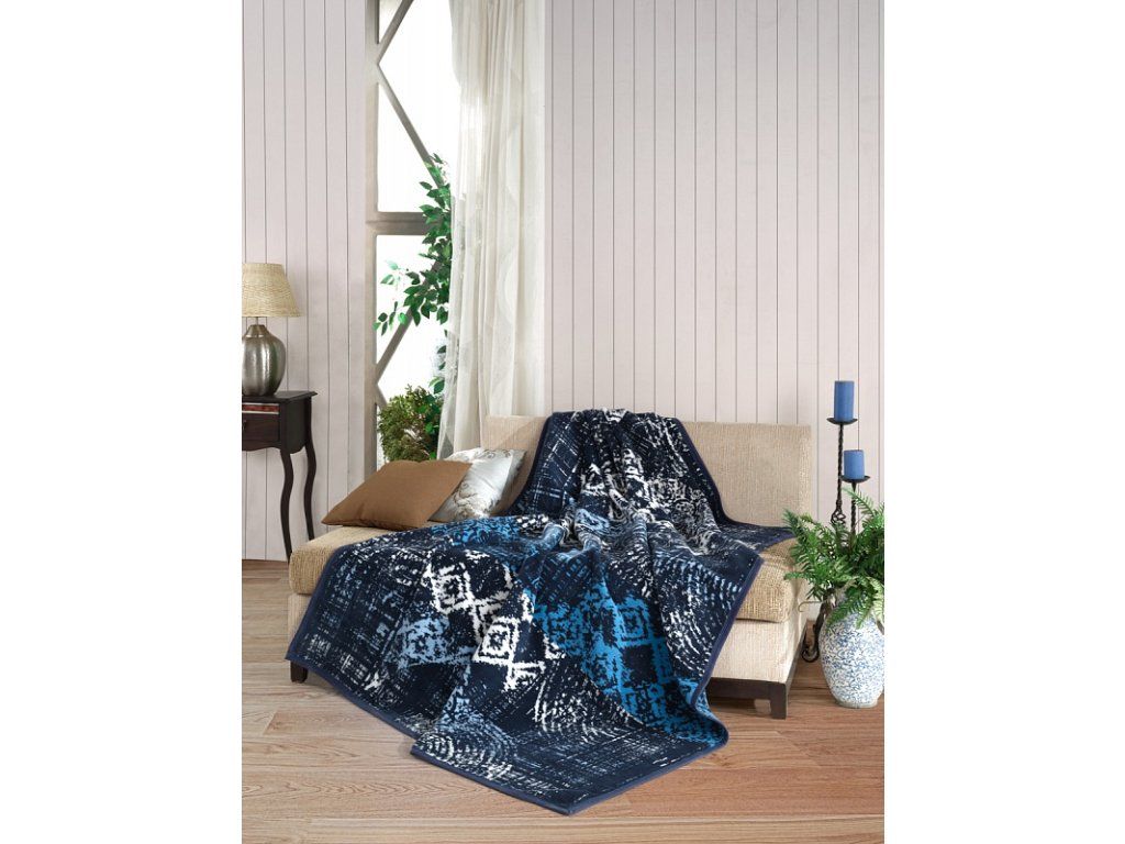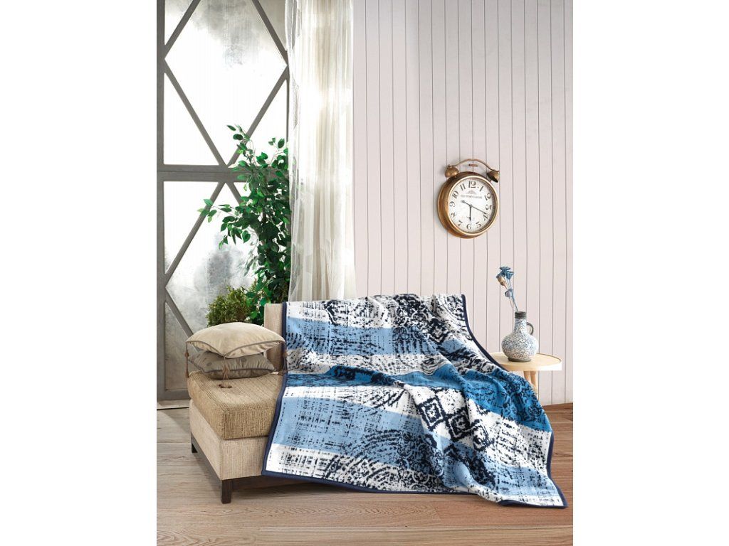 Luxuriöse Baumwolldecke mit dichtem Flor, warm und weich im Griff. Die neue Webrezeptur garantiert Leichtigkeit und hervorragende Atmungsaktivität. Die Decke Mareo wird zu einem einzigartigen Accessoire in Ihrem Zuhause und einem unverzichtbaren Begleiter für kühle Abende. Das moderne Muster mit einem Hauch von Ethnostil in einer Palette von Blautönen in Kombination mit Creme-Weiß verfeinert jeden jugendlichen Innenraum. Die Decke kann auch elegant als dekorative Überwurf verwendet werden. Die Decke, die mit einer invertierten Farbgestaltung glänzt, ist rundum mit farblich abgestimmter Einfassung versehen. Materialzusammensetzung: 60 % Baumwolle, 40 % Acryl Maße: 160/220 cm Gewicht: 450 g/m2 Die Decke kann bei 30 °C mit einem milden Waschmittel gewaschen werden.Zusätzliche Parameter
