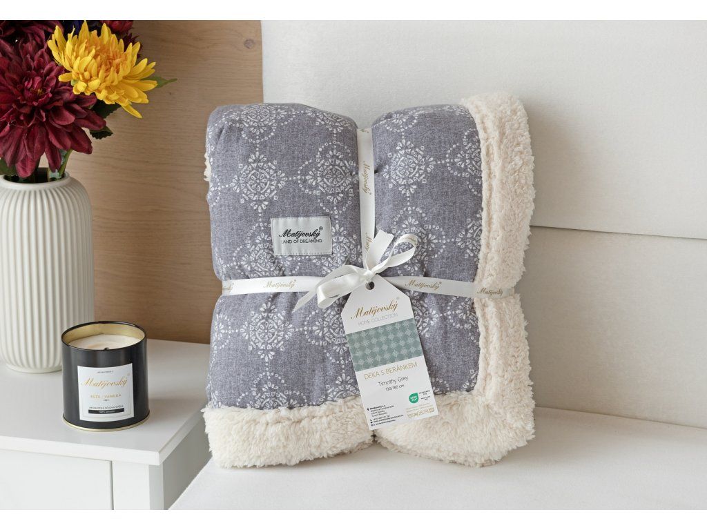 Die Winterabende im gemütlichen Zuhause werden mit der neuen Kollektion von Flanelldecken mit Lamm noch angenehmer. Es ist mehr als nur eine Decke - mit der Lammdecke erhalten Sie einen weichen Begleiter, den Sie mit niemandem teilen möchten. Kuscheln Sie sich ein, machen Sie es sich gemütlich! Dank sorgfältig ausgewählter Motive, die mit Bettwäsche und anderen Wohnaccessoires kombiniert werden können, darf die Lammdecke Timothy Grey in Ihrer häuslichen Oase der Ruhe und Gemütlichkeit nicht fehlen. Oberseite: Premium-Flanell (100% Baumwolle)Unterseite: weiches flauschiges Lamm (100% Polyester) Die Lammdecke kann bei 30°C in der Waschmaschine gewaschen werden. Es wird empfohlen, ein schonendes Programm mit niedrigeren Schleudertouren zu verwenden. Es ist ratsam, flüssige Waschmittel zu wählen und auf die Verwendung von Weichspüler zu verzichten, der die Fasern der unteren Schicht unerwünscht umhüllen und verkleben kann. Die Flanelldecken mit Lamm erfüllen die Kriterien der internationalen Zertifizierung Oeko-Tex Standard 100.Zusätzliche Parameter