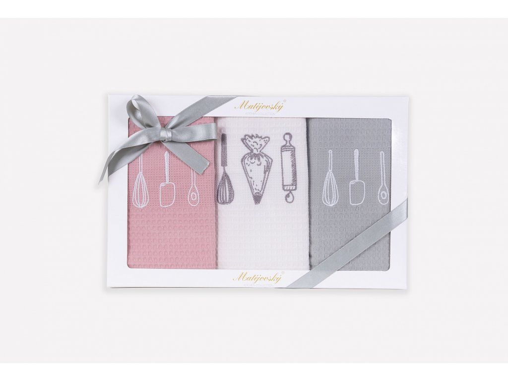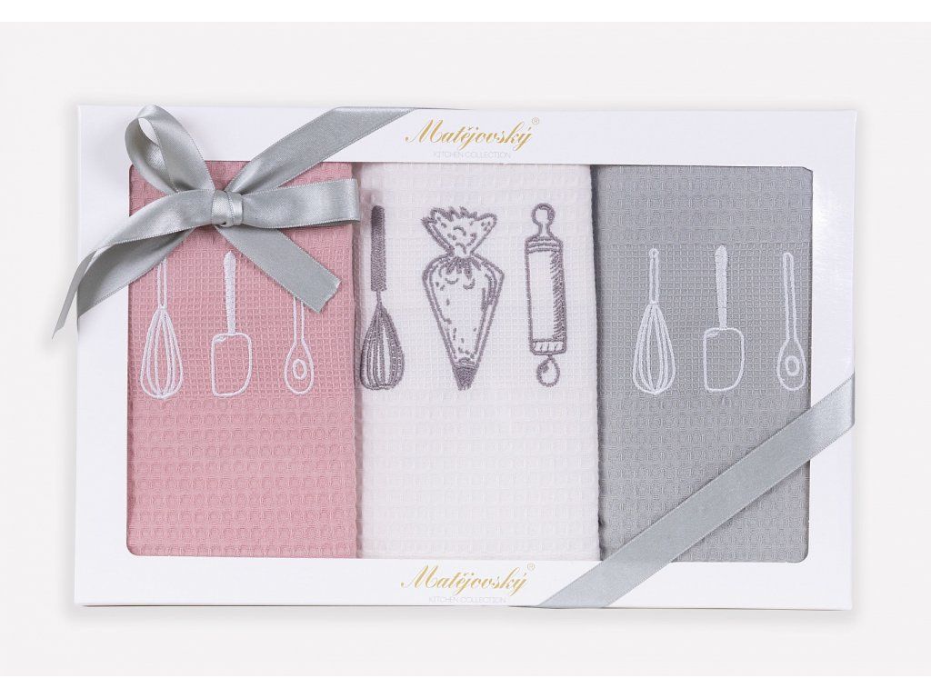 Geschirrtücher sind ein unverzichtbares Accessoire, ohne das kein moderner Haushalt auskommt. Mit dem eleganten Geschenkset aus Waffeltüchern Trio #1 können Sie Ihre Lieben bei jeder Gelegenheit erfreuen! Packungsinhalt: 3 Stück Waffeltücher mit StickereiMaterial: 100% BaumwolleTuchgewicht: 240 g/m2Tuchgröße: 50/70 cmTrio #1: zwei verschiedene Stickereien mit Motiven von Küchenutensilien Hellrosa Tuch, Stickerei 1 Cremefarbenes Tuch, Stickerei 2 Graugrünes Tuch, Stickerei 1 Die Tücher sind mit einer praktischen Schlaufe zum Aufhängen versehen. Pflegehinweise: Tücher können bei 60°C gewaschen, im Trockner bei einem schonenden Programm getrocknet und bei mittlerer Temperatur gebügelt werden. Die glänzende Geschenkbox mit farblich abgestimmtem Band ist ein integraler Bestandteil des Sets. Die Tücher erfüllen die Kriterien der internationalen Zertifizierung Oeko-Tex Standard 100.Zusätzliche Parameter