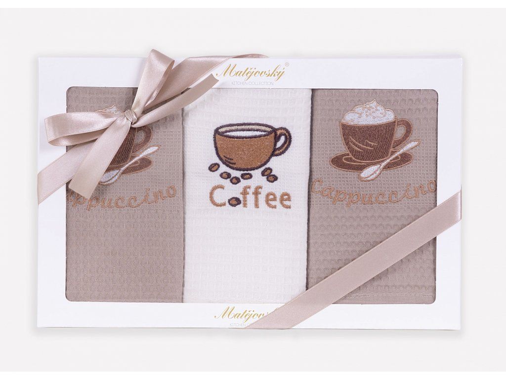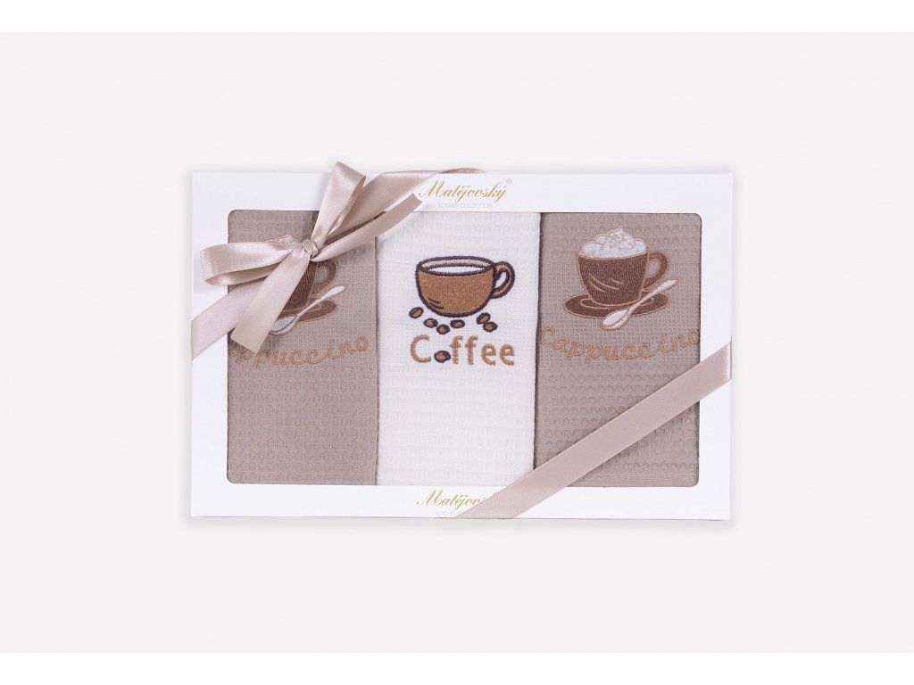 Geschirrtücher sind ein unverzichtbares Zubehör, ohne das kein moderner Haushalt auskommt. Mit dem eleganten Geschenkset aus Waffeltüchern Trio #6 können Sie Ihre Lieben bei jeder Gelegenheit erfreuen! Packungsinhalt: 3 Stück Waffeltücher mit StickereiMaterial: 100% BaumwolleTuchgewicht: 240 g/m2Tuchgröße: 50/70 cmTrio #6: zwei verschiedene Stickereien 2x beige Tuch mit Cappuccino-Motiv 1x cremefarbenes Tuch mit Kaffee-Motiv Die Tücher sind mit einer praktischen Schlaufe zum Aufhängen versehen. Pflege: Die Tücher können bei 60°C gewaschen, im Trockner bei schonendem Programm getrocknet und bei mittlerer Temperatur gebügelt werden. Die glänzende Geschenkbox mit farblich abgestimmter Schleife ist ein integraler Bestandteil des Sets. Die Tücher erfüllen die Kriterien der internationalen Zertifizierung Oeko-Tex Standard 100.Zusätzliche Parameter