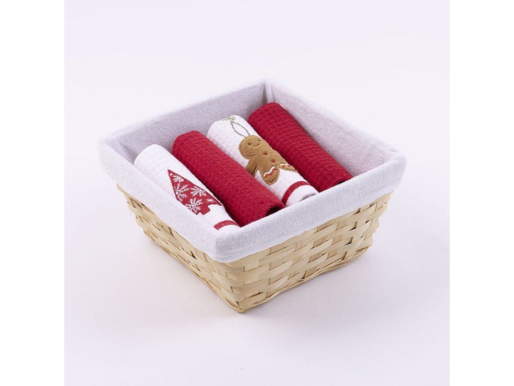 Geschirrtücher sind ein unverzichtbares Accessoire, ohne das kein moderner Haushalt auskommt. Überraschen Sie Ihre Lieben mit einem praktischen Set von Waffeltüchern aus 100% Baumwolle. Die Verpackung enthält zwei Sets von Tüchern (insgesamt 4 Stück): Set Bäumchen1x weißes Tuch mit Stickerei und rotem Rand1x einfarbig rotes Tuch Set Lebkuchen1x weißes Tuch mit Stickerei und rotem Rand1x einfarbig rotes Tuch Tuchgewicht: 350 g/m2Tuchgröße: 40/60 cm Die Tücher sind mit einer praktischen Schlaufe versehen und können bei 60 °C in der Waschmaschine gewaschen werden. Der Weidenkorb mit Stoffeinlage ist zusammen mit den Tüchern in Zellophan verpackt und mit einer dekorativen Schleife ergänzt.Zusätzliche Parameter