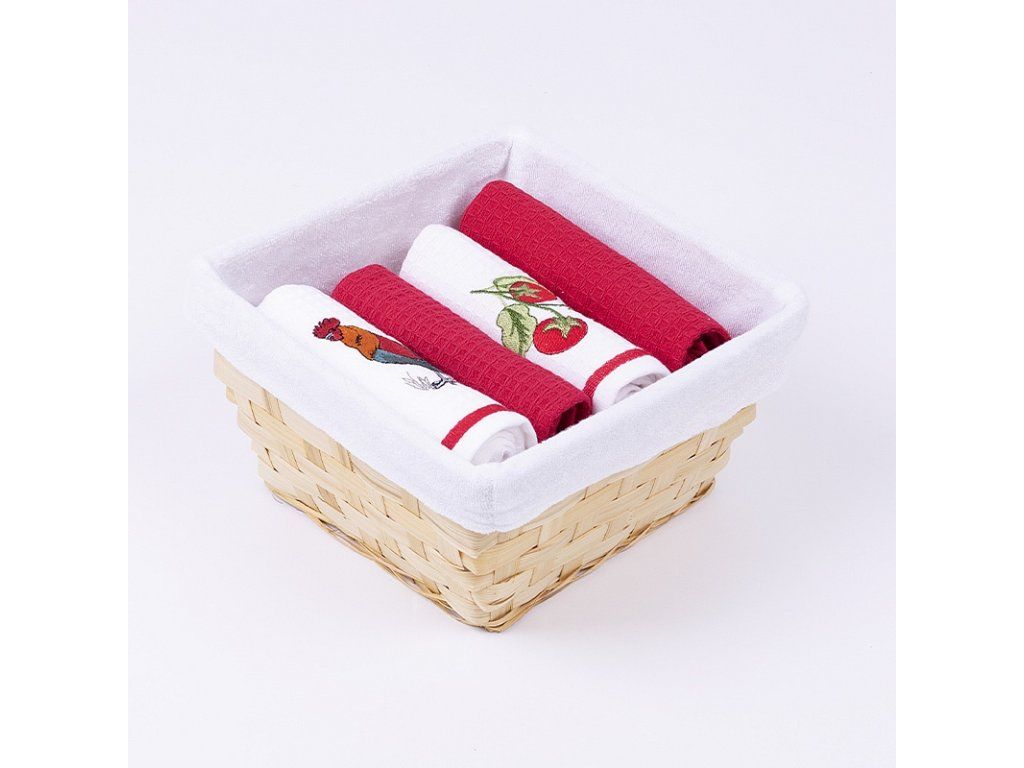 Geschirrtücher sind ein unverzichtbares Zubehör, ohne das kein moderner Haushalt auskommt. Überraschen Sie Ihre Lieben mit einem praktischen Set von Waffeltüchern aus 100% Baumwolle. Die Verpackung enthält zwei Sets von Tüchern (insgesamt 4 Stück): Set Hahn1x weißes Tuch mit Stickerei und roter Bordüre1x einfarbig rotes Tuch Set Tomate1x weißes Tuch mit Stickerei und roter Bordüre 1x einfarbig rotes Tuch Tuchgewicht: 350 g/m2Tuchmaße: 40/60 cm Die Tücher sind mit einer praktischen Schlaufe versehen und können in der Waschmaschine bei 60 °C gewaschen werden. Der Weidenkorb mit textiler Einlage ist zusammen mit den Tüchern in Zellophan verpackt und mit einer dekorativen Schleife versehen.Zusätzliche Parameter