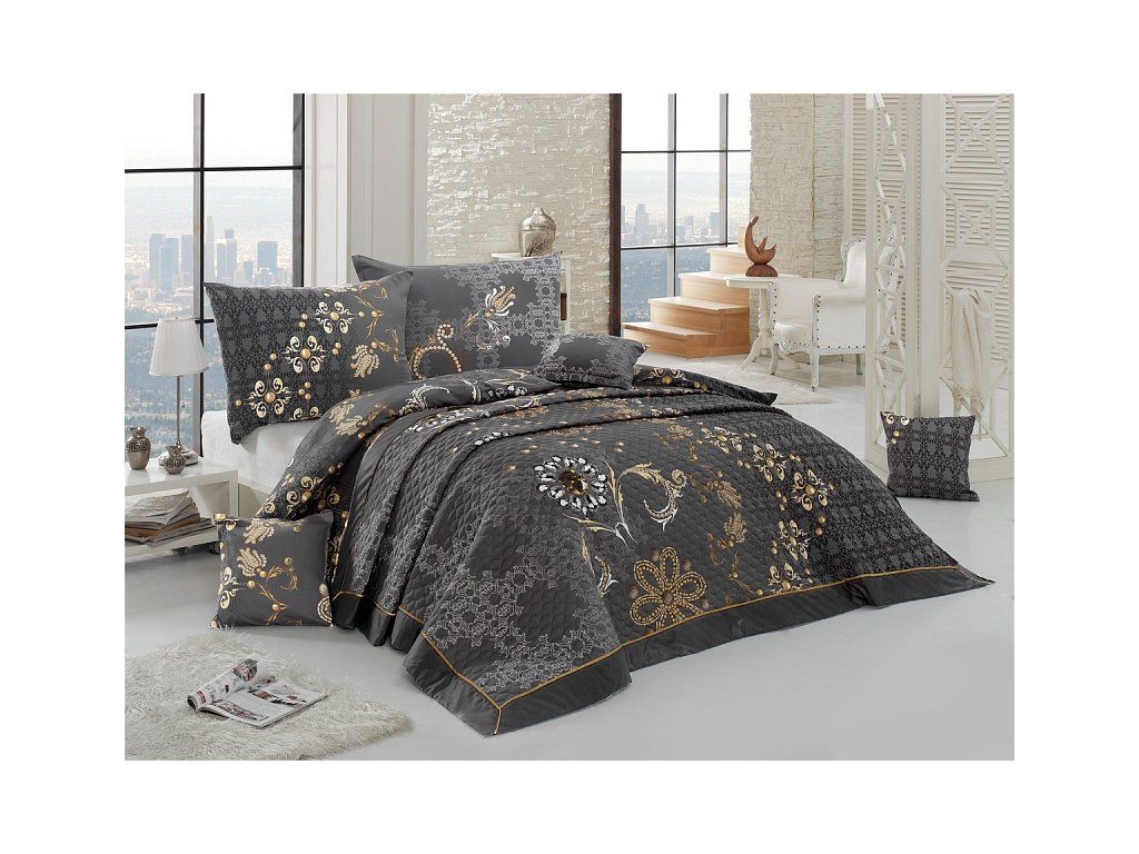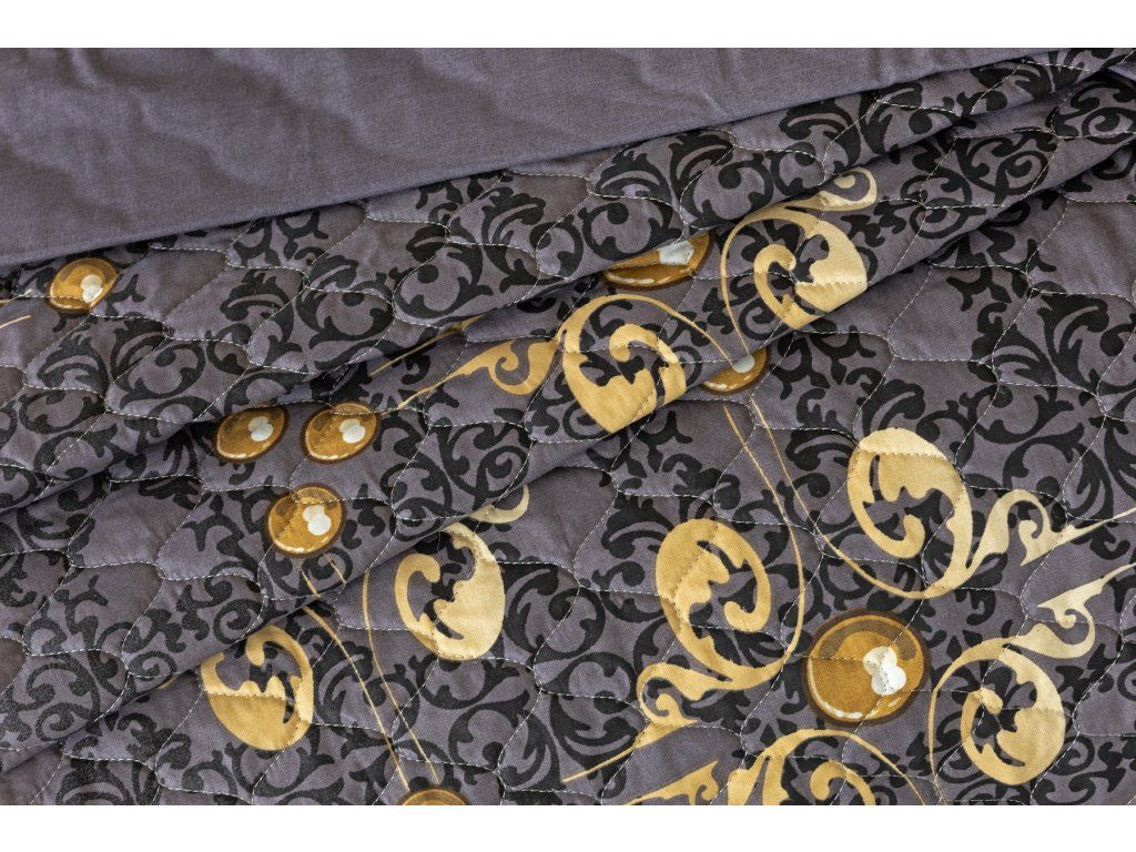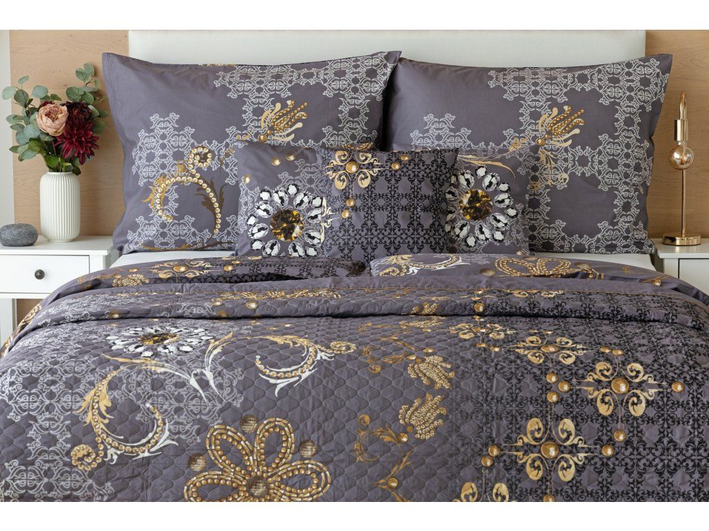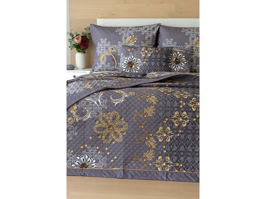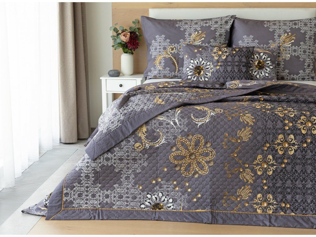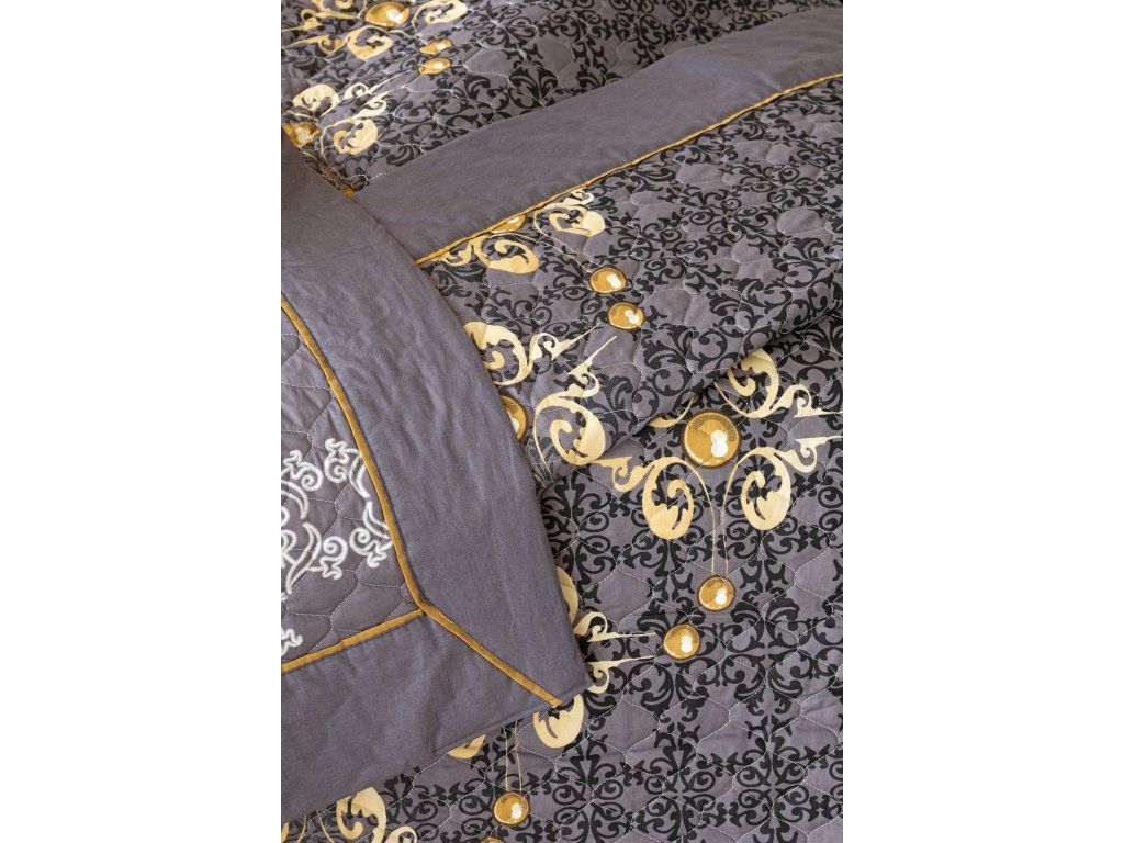 Die Gold-Bettüberwurf ist eine einzigartige ästhetische und praktische Ergänzung, mit der Ihr Bett immer perfekt gemacht ist. Als Füllung wird mehrschichtiges Hohlfaser mit reduziertem Gewicht verwendet. Das Obermaterial besteht aus 100% Baumwollstoff im gleichen Design wie die Bettwäsche. Über die gesamte Fläche ist eine dekorative Steppung aufgebracht, um die Stabilität der Füllung zu gewährleisten und gleichzeitig das Gesamtbild des Überwurfs zu betonen. Füllgewicht: 120 g/m2 Farbgebung: Elegantes Muster in einer Palette von Anthrazit- und Grautönen mit goldenen Elementen. Das Muster des Überwurfs ist auf beiden Seiten gleich, der Rand ist auf einer Seite mit einer goldenen Paspel verziert. Pflege: Die Überwürfe können in einer ausreichend großen Waschmaschine bei 40°C gewaschen werdenZusätzliche Parameter