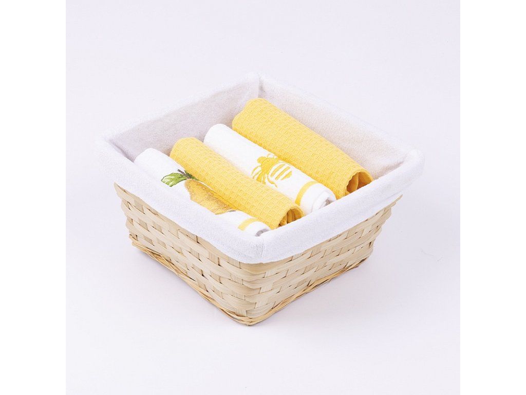 Küchentücher sind ein unverzichtbares Zubehör, ohne das kein moderner Haushalt auskommt. Überraschen Sie Ihre Lieben mit einem praktischen Set von Waffeltüchern aus 100% Baumwolle. Die Verpackung enthält zwei Sets von Tüchern (insgesamt 4 Stück): Set Birne1x weißes Tuch mit Stickerei und gelber Bordüre1x gelbes einfarbiges Tuch Set Biene1x weißes Tuch mit Stickerei und gelber Bordüre1x gelbes einfarbiges Tuch Tuchgewicht: 350 g/m2Tuchgröße: 40/60 cm Die Tücher sind mit einer praktischen Schlaufe versehen und können bei 60 °C in der Waschmaschine gewaschen werden. Der Weidenkorb mit Stoffeinsatz ist zusammen mit den Tüchern in Zellophan verpackt und mit einer dekorativen Schleife versehen.Zusätzliche Parameter