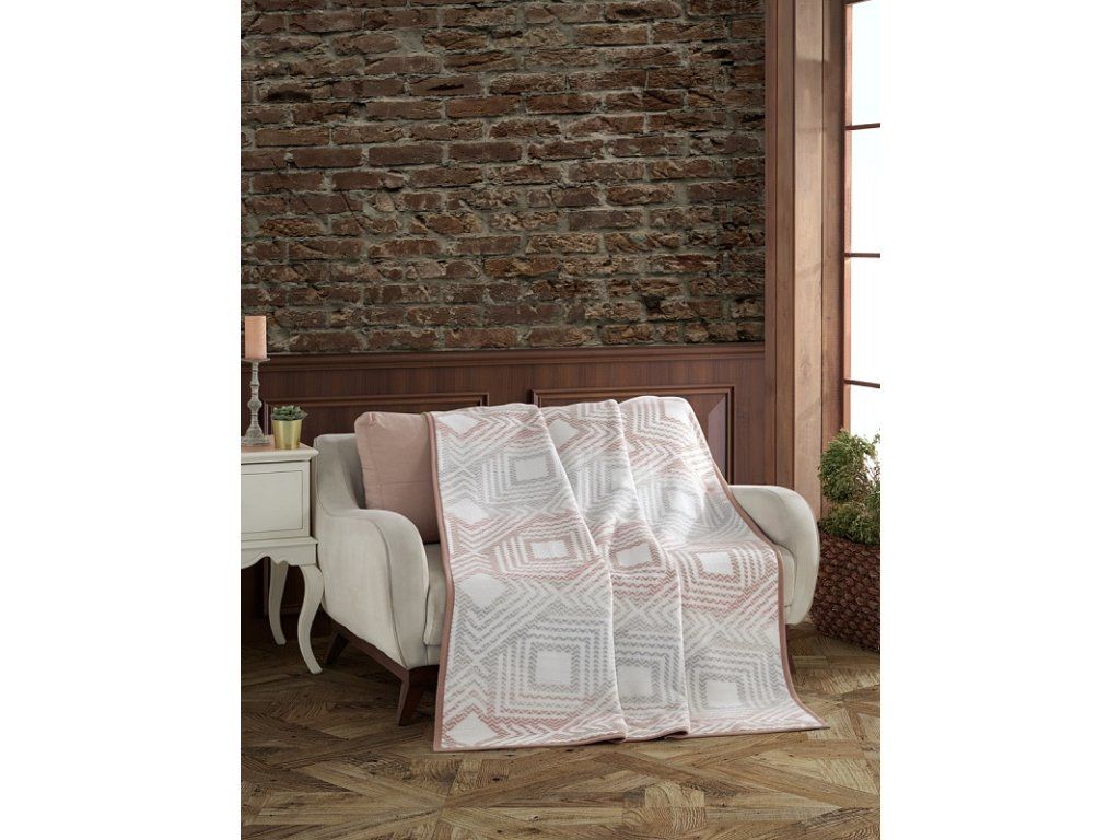 Luxuriöse Baumwolldecke mit dichtem Flor, warm und weich im Griff. Die neue Webrezeptur garantiert Leichtigkeit und hervorragende Atmungsaktivität. Die Decke Irelyn wird zu einem einzigartigen Accessoire in Ihrem Zuhause und einem unverzichtbaren Begleiter für kühle Abende. Sie können die Decke auch elegant als dekorative Überwurf verwenden. Die Decke, die mit einer umgekehrten Farbgebung glänzt, ist rundum mit farblich abgestimmter Einfassung versehen. Design: geometrisches Muster in den Farben Weiß, Beige, Hellgrau, Puder und Altrosa. Materialzusammensetzung: 60 % Baumwolle, 40 % Acryl. Maße: 160/220 cm. Grammatur: 450 g/m2. Die Decke kann bei 30 °C mit einem milden Waschmittel gewaschen werden.Zusätzliche Parameter