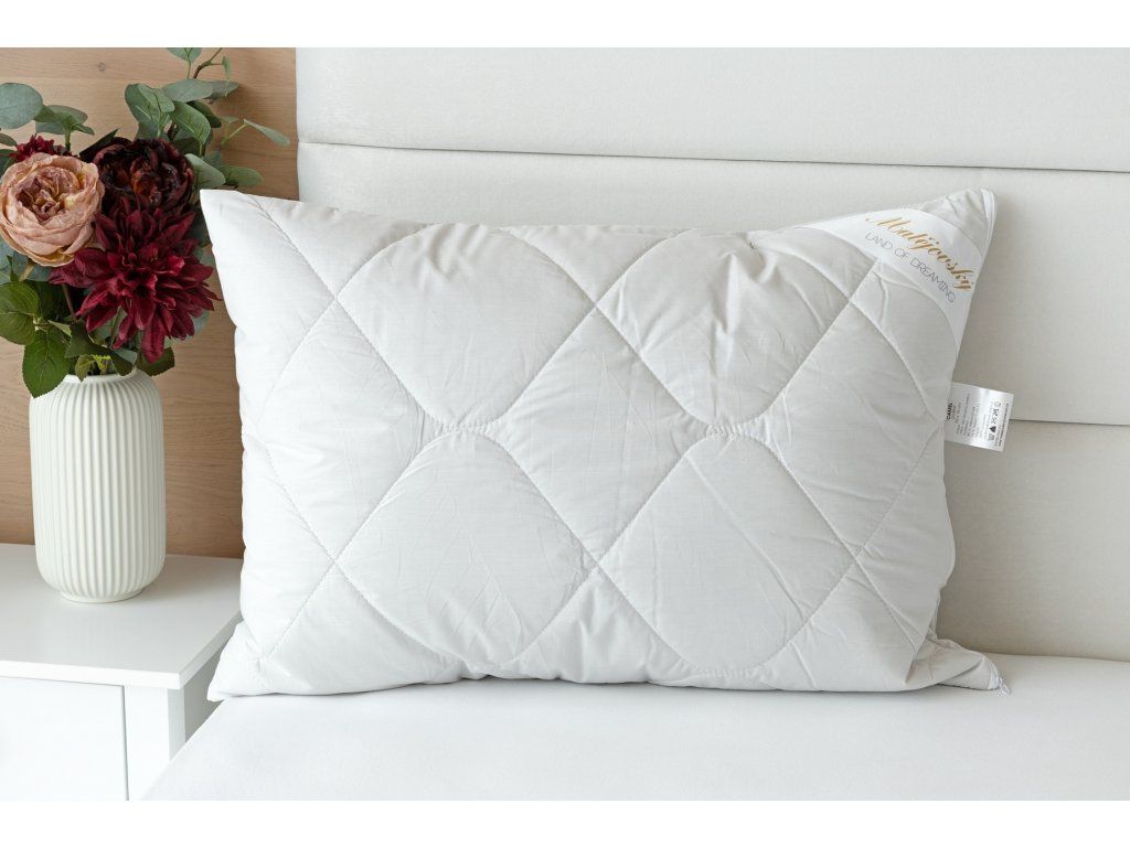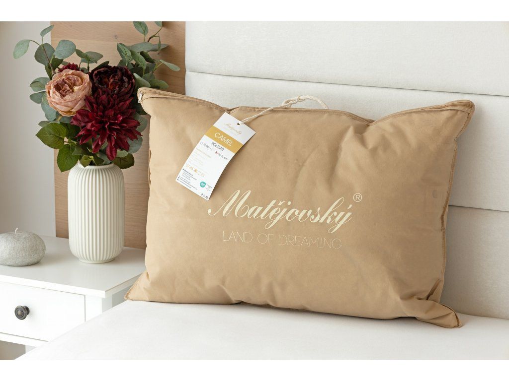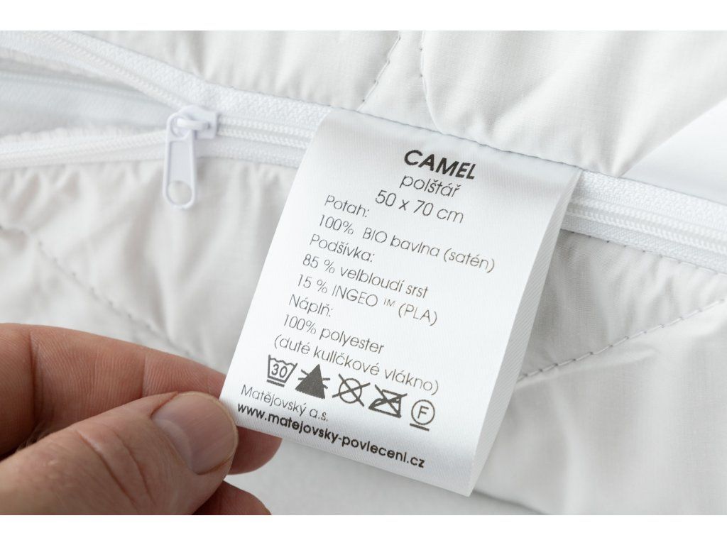 Die Kissen aus unserer neuen luxuriösen Kollektion CAMEL werden Sie mit ihrer hochwertigen Verarbeitung und voll funktionsfähigen Eigenschaften begeistern. Das Kamelhaar findet bei der Herstellung von Bettwaren aufgrund seiner außergewöhnlichen thermoregulierenden Eigenschaften Anwendung, die für einen ruhigen Schlaf ohne Temperaturschwankungen sorgen. Das Kamelhaar ist im Kissen in einem Futter des oberen Baumwollbezugs enthalten, was für eine effektive Thermoregulierung ausreichend ist und gleichzeitig pflegeleicht ist. Die Füllung des Kissens besteht aus Polyesterkügelchen, die dafür sorgen, dass die Füllung atmungsaktiv und voluminös ist, nicht zusammenfällt und sich gut aufschütteln lässt. Im Vergleich zu Kissen, die mit hohlen silikonisierten Fasern gefüllt sind, ist das Camel-Kissen etwas fester und bietet stabilen Halt. Das Gewicht der Füllung ist für jede Größe standardisiert, um maximalen Komfort zu bieten. Bei beiden verfügbaren Größen 70/90 cm und 50/70 cm kann das Volumen durch Zugabe oder Entfernen von Polyesterfüllung je nach individuellem Bedarf reguliert werden. Kissen in diesen Größen sind mit einem gesteppten abnehmbaren Bezug mit Reißverschluss ausgestattet. Füllung: 100% Polyester (hohle Kügelchen) Bezug: 100% BIO-Baumwolle (Satinverarbeitung, GOTS-Zertifizierung) Futter: 85% Kamelhaar + 15% INGEO IM (PLA) Eigenschaften: antiallergisch, antibakteriell, atmungsaktiv, thermoregulierend Verpackung: Das Kissen aus der Camel-Serie wird ohne Kunststoffverpackung geliefert, in einer praktischen Tasche aus Vliesstoff Pflege: Waschbar bei 30 °C (bei geringer Verschmutzung empfehlen wir, nur den abnehmbaren Bezug zu waschen), nicht trocknergeeignet KISSEN 70/90 cm Füllgewicht 1100 g abnehmbarer gesteppter Bezug mit Reißverschluss KISSEN 50/70 cm Füllgewicht 600 g abnehmbarer gesteppter Bezug mit Reißverschluss Die Kissen aus der Camel-Serie erfüllen die Kriterien der internationalen Zertifizierung Oeko-Tex Standard 100, und der Bezugstoff ist zusätzlich mit dem GOTS-Zertifikat (garantierter Anteil an biologisch zertifizierten Fasern von mindestens 95 %) versehen.Zusätzliche Parameter