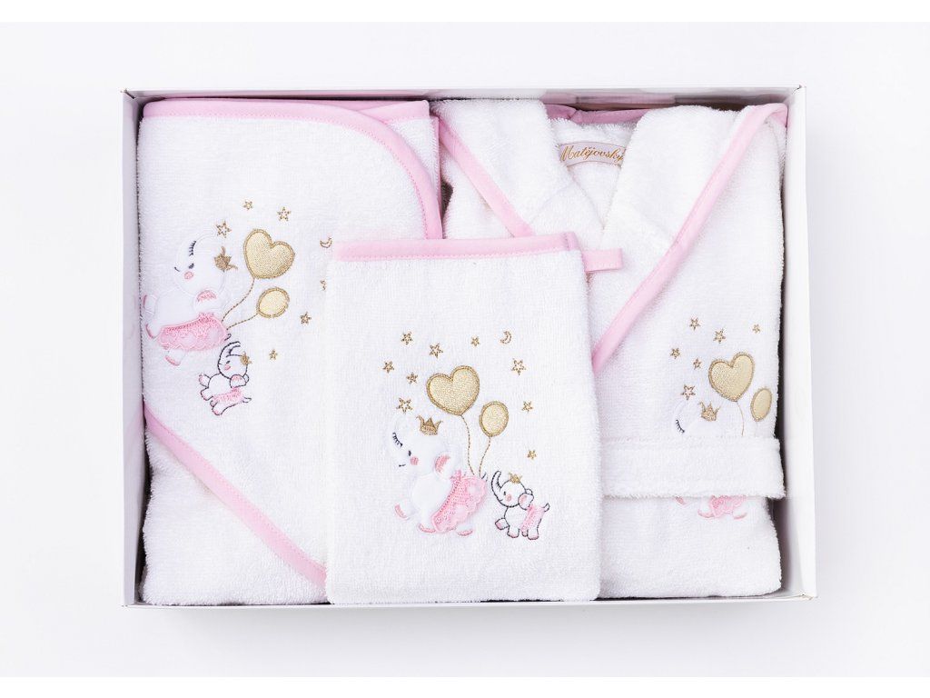 Sie haben gerade das perfekte Kinder-Frottee-Set entdeckt, das Ihrem Baby Komfort und Pflege bietet. Alle Produkte in diesem elegant verpackten Geschenkset sind aus hochwertiger Baumwolle gefertigt, die hypoallergen ist, sanft zur empfindlichen Babyhaut und maximalen Komfort garantiert. Neben der Praktikabilität und Nützlichkeit aller Accessoires bietet dieses Set auch ein bezauberndes Design, das durch aufwendige niedliche Stickereien und farblich abgestimmte Säume hervorgehoben wird. Das Geschenkset Bimbo mit gestickten Sonnen und Luftballons ist dank der rosa Umrandung ideal für kleine Prinzessinnen. Die Materialqualität gewährleistet eine lange Lebensdauer, und Mütter werden sicherlich die einfache Pflege zu schätzen wissen. Gönnen Sie Ihrem Baby nur das Beste! Das Geschenkset enthält: Bademantel (Größe 1-2 Jahre) Kapuzenhandtuch 80 x 80 cm Handtuch 40 x 60 cm Handtuch 30 x 30 cm Waschlappen 35 x 35 cm Waschlappen 35 x 30 cm Frottee-Waschlappen 15 x 21 cm Material: 100% Baumwolle Bademantel, größeres Handtuch und Waschlappen sind mit einer praktischen Schlaufe zum Aufhängen versehen. Alle Produkte können bei 40°C gewaschen und im Trockner getrocknet werden. Bei stärkerer Verschmutzung oder bei Milbenallergie kann bei 60°C gewaschen werden, aber niedrigere Temperaturen bei normaler Verschmutzung verlängern die Lebensdauer der Fasern. Die Produkte erfüllen die Kriterien der internationalen Zertifizierung Oeko-Tex Standard 100.Zusätzliche Parameter
