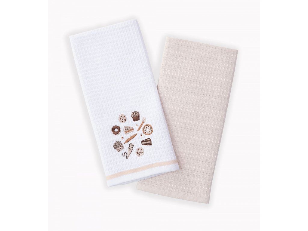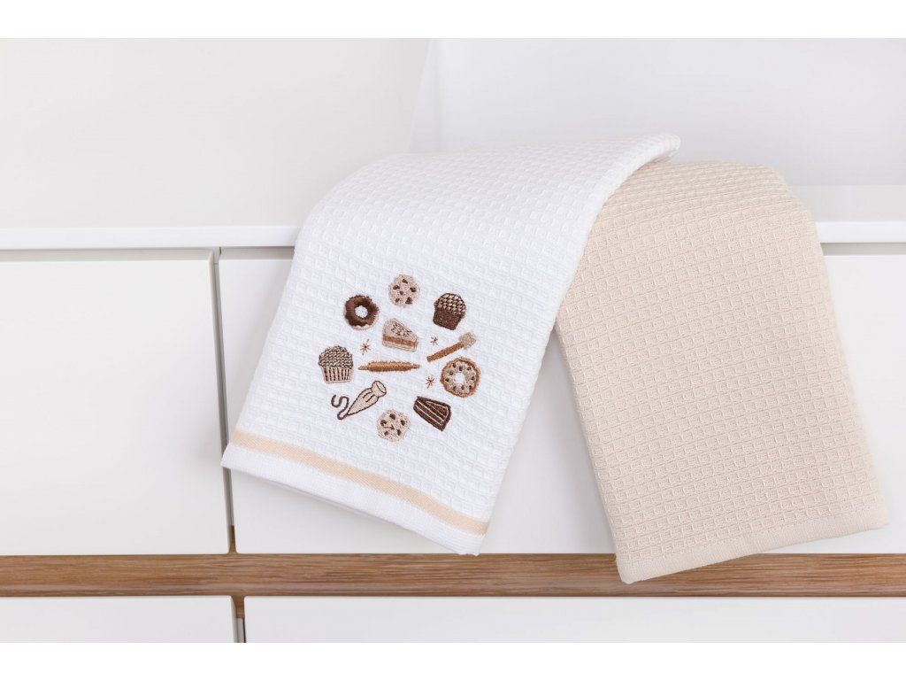 Geschirrtücher sind ein unverzichtbares Zubehör, ohne das kein moderner Haushalt auskommt. Die traditionelle Waffelstruktur in Verbindung mit den feinsten 100% Baumwollgarnen garantiert eine hervorragende Saugfähigkeit. Die Tücher sind mit einer praktischen Schlaufe zum Aufhängen versehen. Die attraktiven und präzise gearbeiteten glänzenden Stickereien ergänzen sich perfekt mit den bezaubernden Farbtönen in der gesamten Kollektion von Waffeltüchern. Das elegant verpackte Set enthält zwei farblich abgestimmte Tücher im Maß 40/60 cm. 1x weißes Tuch mit Stickerei und beiger Bordüre 1x einfarbiges beiges Tuch Grammatur: 350 g/m2 Pflege: Waschbar in der Waschmaschine bei 60 °C, trocknergeeignet.Zusätzliche Parameter