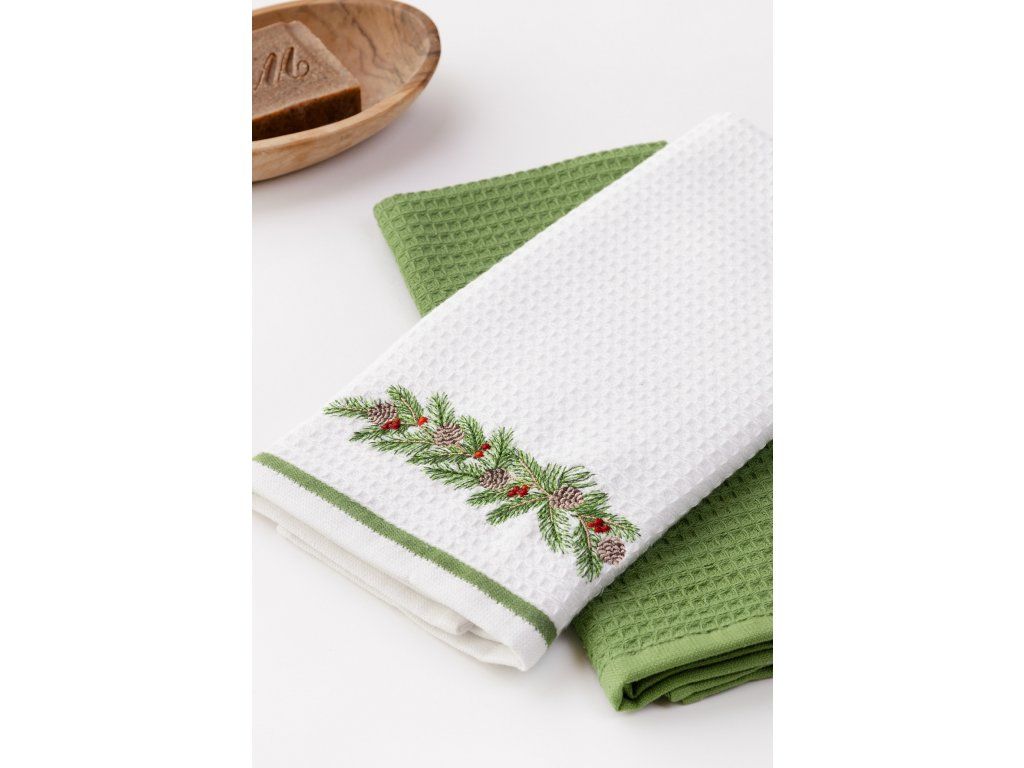 Geschirrtücher sind ein unverzichtbares Accessoire, ohne das kein moderner Haushalt auskommt. Die traditionelle Waffelstruktur in Verbindung mit den feinsten 100% Baumwollgarnen garantiert eine hervorragende Saugfähigkeit. Die Tücher sind mit einer praktischen Schlaufe zum Aufhängen versehen. Die attraktiven und präzise gearbeiteten glänzenden Stickereien harmonieren perfekt mit den bezaubernden Farbtönen in der gesamten Kollektion der Waffelgeschirrtücher. Der elegant verpackte Set enthält zwei farblich abgestimmte Geschirrtücher im Maß 40/60 cm. 1x weißes Geschirrtuch mit Stickerei und grüner Bordüre 1x einfarbig grünes Geschirrtuch Gewicht: 350 g/m2 Pflege: Waschbar in der Maschine bei 60 °C, trocknergeeignet.Zusätzliche Parameter