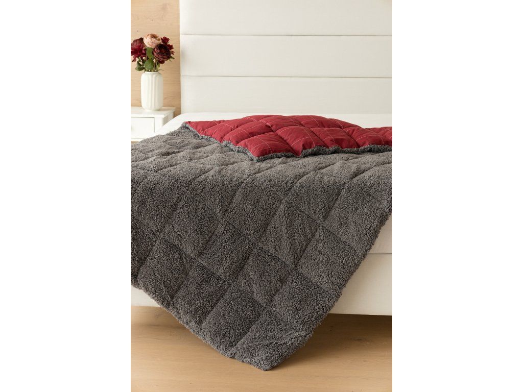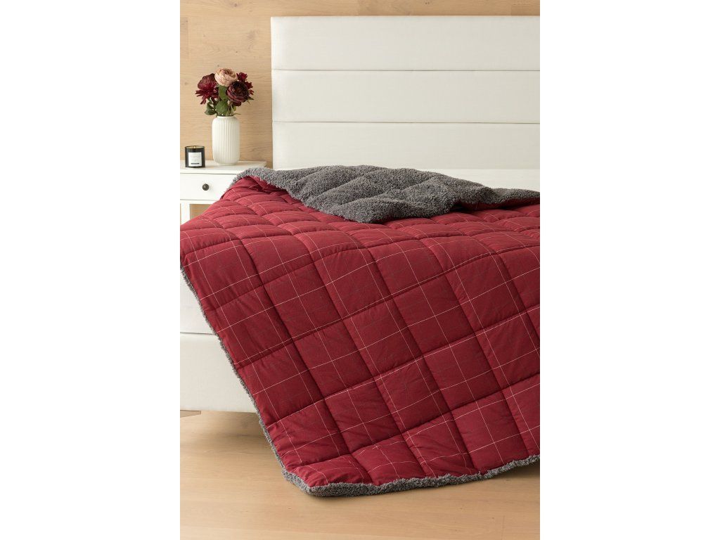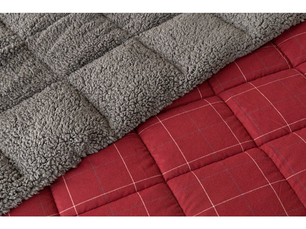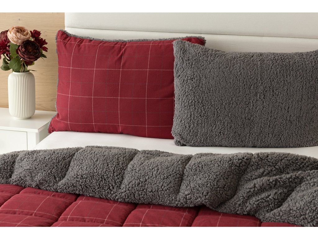 NUR SOLANGE DER VORRAT REICHT! 1x Flanellkissen mit Lamm 50/70 cm, Füllgewicht 800 g, regulärer Preis 690 CZK 1x Gesteppte Flanelldecke mit Lamm 140/200 cm, Grammatur 250 g/m2, regulärer Preis 2.990 CZK Materialzusammensetzung: Oberseite: (Flanell) Mischung aus recycelter Baumwolle und Polyester Unterseite: (Lamm) 100% Polyester Füllung: 100% Polyester Glück begünstigt die Vorbereiteten! Lassen Sie sich vom kalten Wetter nicht überraschen und gönnen Sie sich eine wohlverdiente Erholung in der Wärme... Die neue Kollektion von Flanell-Bettwäsche mit Lamm garantiert Ihnen ein einzigartiges Wärmegefühl und unglaublichen Komfort an regnerischen Tagen, kühlen Abenden und Winternächten. Die Oberseite der Bettwäsche besteht aus weichem Flanell mit feiner Florstruktur, die Unterseite ist mit warmem, flauschigem Lamm bedeckt. Das Muster "Linda" in festlichem Rot mit feinem kariertem Motiv wird durch das dunkelgraue Lamm ergänzt. Decke: Die innere Füllung besteht aus Mikrogel-Polyesternanofasern, die atmungsaktiv, leicht und nicht verklumpend sind. Die Stabilität der Füllung wird durch präzises Steppen über die gesamte Fläche gewährleistet. Dank der geringen Grammatur können Sie diese praktischen Decken das ganze Jahr über nutzen. In kälteren Zeiten kuscheln Sie sich in das weiche Lamm, das eine ausgezeichnete Wärmeisolierung bietet, in wärmeren Monaten drehen Sie die Decke einfach um. Kissen: Die innere Füllung besteht aus flauschigen Polyester-Nanofasern, die den Bezug aus Vliesstoff schützen. Der Oberbezug ist abnehmbar und verfügt über einen praktischen Reißverschluss an der Seite. Dank des attraktiven Designs können diese Kissen auch als Dekoration dienen - nichts geht über ein Kissen auf dem Sofa, das gut aussieht und gleichzeitig nützlich ist, wenn plötzliche Müdigkeit einsetzt! Pflege: Kissen und Decke können (am besten getrennt) in einer ausreichend großen Waschmaschine bei 40°C gewaschen werden. Bei normaler Verschmutzung kann nur der abnehmbare Bezug des Kissens gewaschen werden. Das Trocknen im Trockner wird nicht empfohlen, jedoch trocknen die verwendeten Materialien sehr schnell. Die Kollektion von Lamm-Bettwäsche erfüllt die Kriterien der internationalen Zertifizierung Oeko-Tex Standard 100.Zusätzliche Parameter
