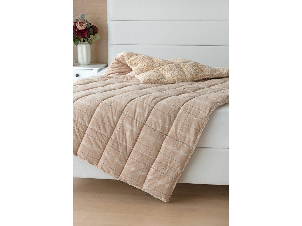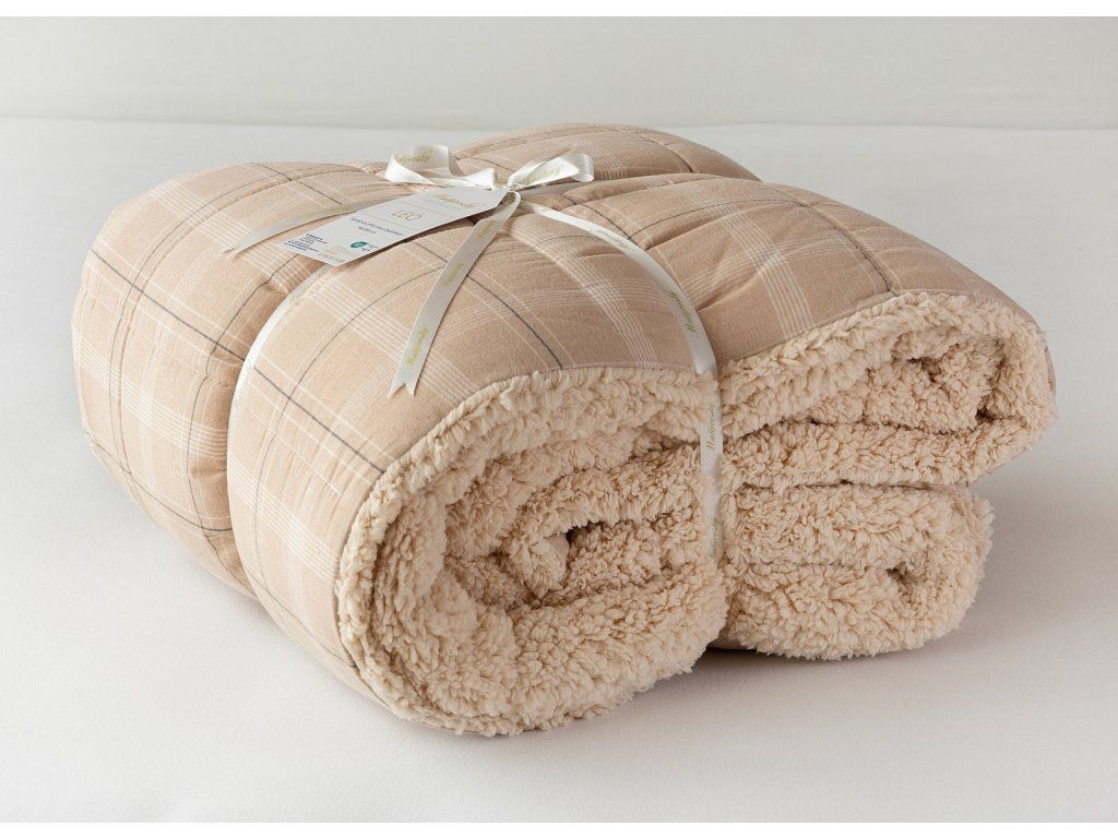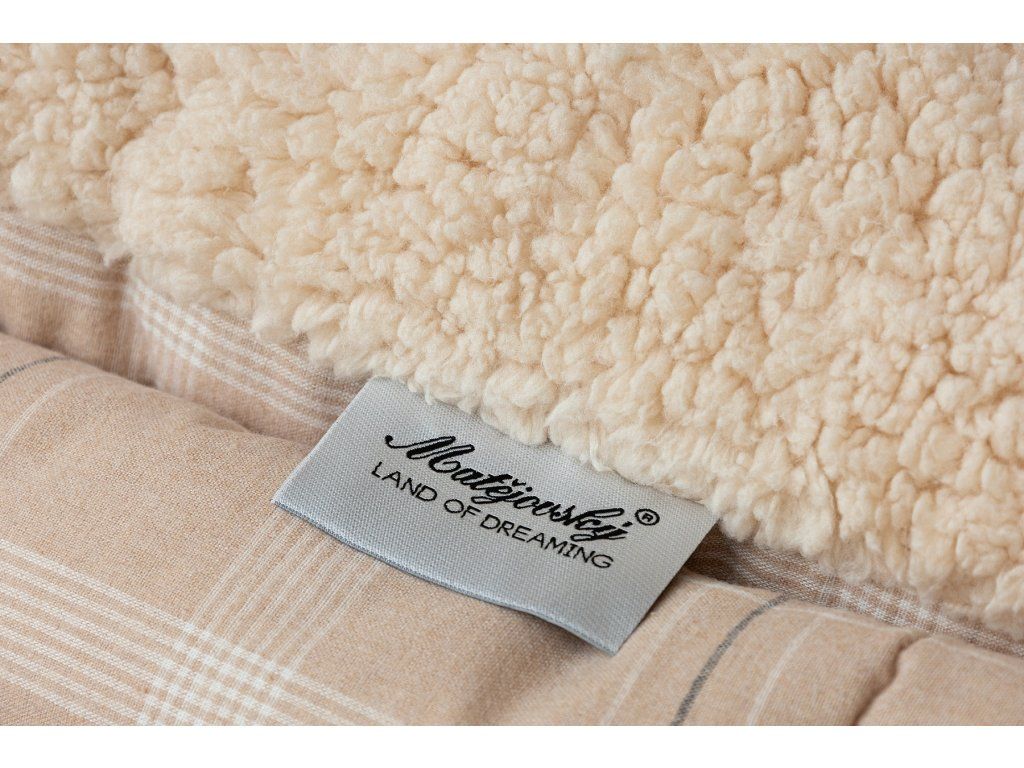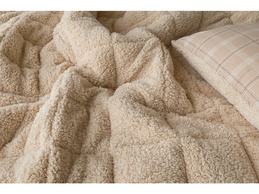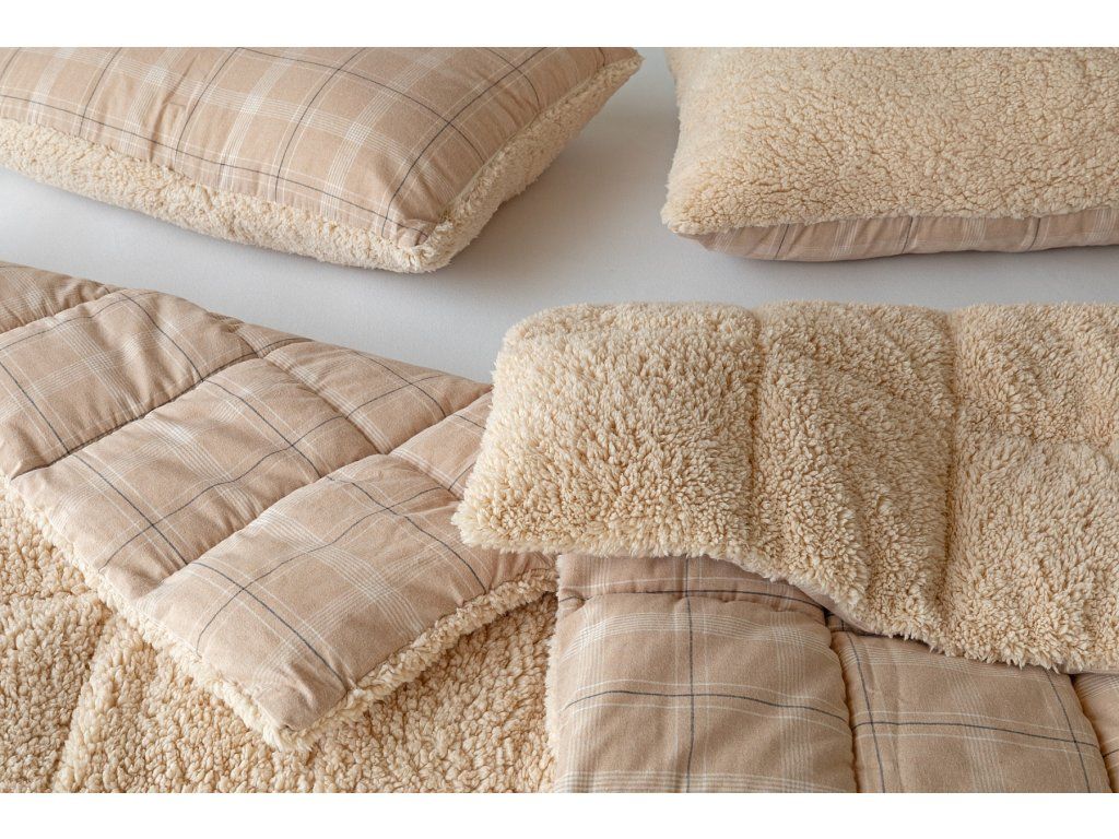NUR SOLANGE DER VORRAT REICHT! 1x Flanellkissen mit Lamm 50/70 cm, Füllgewicht 800 g, regulärer Preis 690 CZK 1x Flanellsteppdecke mit Lamm 140/200 cm, Grammatur 250 g/m2, regulärer Preis 2.990 CZK Materialzusammensetzung: Oberseite: (Flanell) Mischung aus recycelter Baumwolle und Polyester Unterseite: (Lamm) 100% Polyester Füllung: 100% Polyester Glück begünstigt die Vorbereiteten! Lassen Sie sich nicht vom kalten Wetter überraschen und gönnen Sie sich eine wohlverdiente Erholung in der Wärme... Die neue Kollektion von Flanell-Bettwäsche mit Lamm bietet Ihnen ein einzigartiges Wärmegefühl und unglaublichen Komfort an regnerischen Tagen, kalten Abenden und Winternächten. Die Oberseite der Bettwäsche besteht aus weichem Flanell mit feinem Flor, die Unterseite ist mit wärmendem flauschigem Lamm bedeckt. Das Muster Leo mit dezentem Karomuster in einer Palette von Beige- und Cremetönen wird farblich auf das beige Lamm abgestimmt. Steppdecke: Die innere Füllung besteht aus mikrogelartigen Polyester-Nanofasern, die atmungsaktiv, leicht und nicht verklumpend sind. Die Stabilität der Füllung wird durch präzises Steppen über die gesamte Fläche gewährleistet. Dank der geringen Grammatur können Sie diese praktischen Steppdecken das ganze Jahr über nutzen. In kälteren Zeiten kuscheln Sie sich in das weiche Lamm, das eine ausgezeichnete Wärmeisolierung bietet, in wärmeren Monaten drehen Sie die Decke einfach um. Kissen: Die innere Füllung besteht aus flauschigen Polyester-Nanofasern, die den Bezug aus Vliesstoff schützen. Der obere Bezug ist abnehmbar und verfügt über einen praktischen Reißverschluss an der Seite. Dank des attraktiven Designs können diese Kissen auch dekorativ verwendet werden - es gibt nichts Besseres, als ein Kissen auf dem Sofa zu haben, das gut aussieht und gleichzeitig nützlich ist, wenn plötzliche Müdigkeit eintritt! Pflege: Kissen und Steppdecke können (am besten getrennt) in einer ausreichend großen Waschmaschine bei 40°C gewaschen werden. Bei normaler Verschmutzung kann nur der abnehmbare Bezug des Kissens gewaschen werden. Das Trocknen im Trockner wird nicht empfohlen, jedoch trocknen die verwendeten Materialien sehr schnell. Die Kollektion von Lamm-Bettwäsche erfüllt die Kriterien der internationalen Zertifizierung Oeko-Tex Standard 100.Zusätzliche Parameter