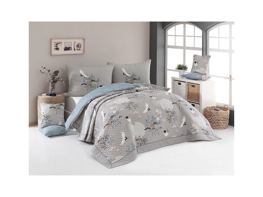Die Minori-Bettüberwurf ist eine einzigartige ästhetische und praktische Ergänzung, mit der das Bett immer perfekt gemacht ist. Als Füllung wird geschichtetes Hohlfaser verwendet, das Obermaterial besteht aus 100% Baumwollstoff in demselben Design wie die Bettwäsche. Die gesamte Fläche ist mit dekorativen Steppungen versehen, um die Stabilität der Füllung zu gewährleisten und gleichzeitig das Gesamtbild des Überwurfs zu betonen. Farbgestaltung: Der Überwurf wird von Tönen in metallischem Grau und pastellblau dominiert, die Unterseite des Überwurfs ist blau mit einer weißen Blumenkontur, ergänzt durch farblich abgestimmte dekorative Paspel. Pflege: Der Überwurf kann in der Waschmaschine bei 40 °C gewaschen werden.Zusätzliche Parameter