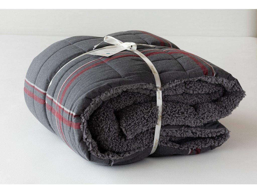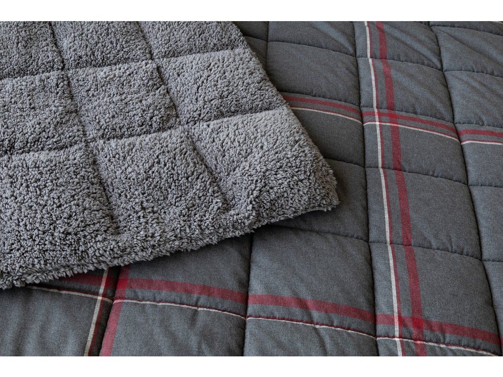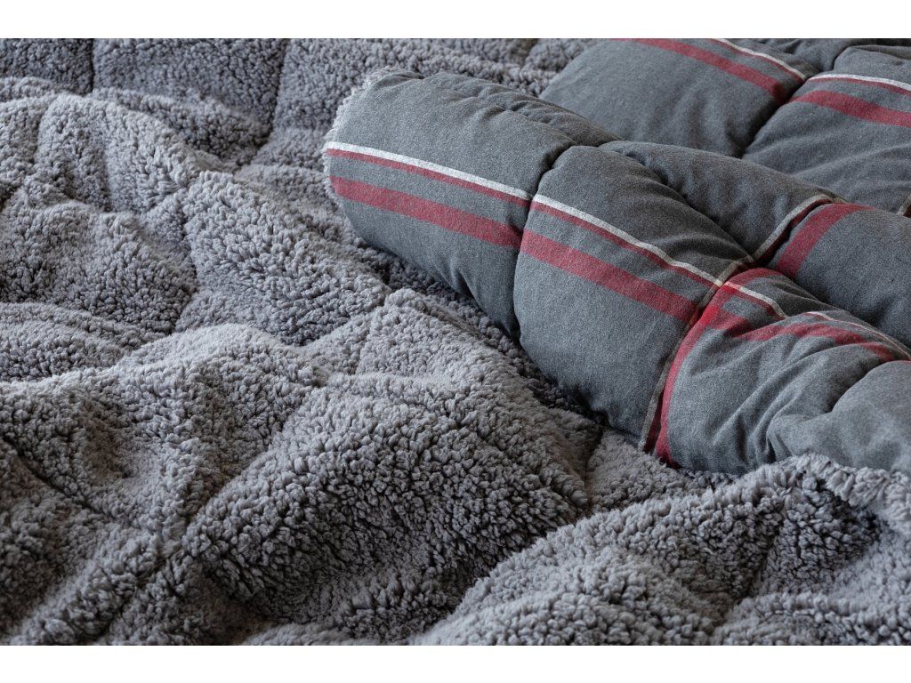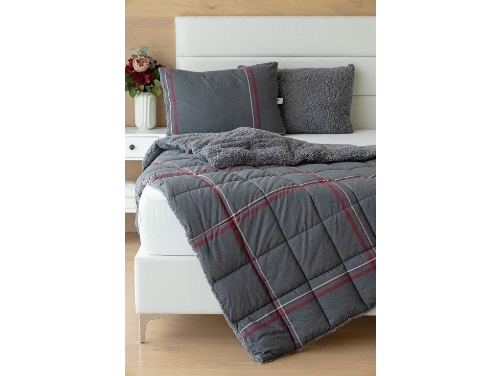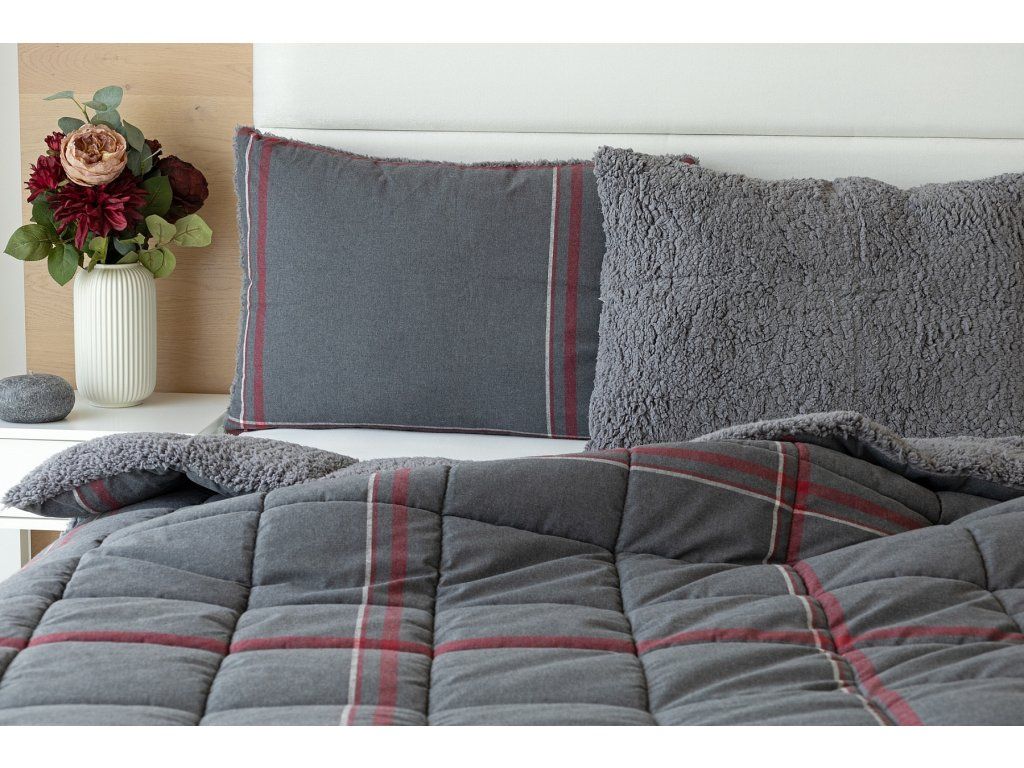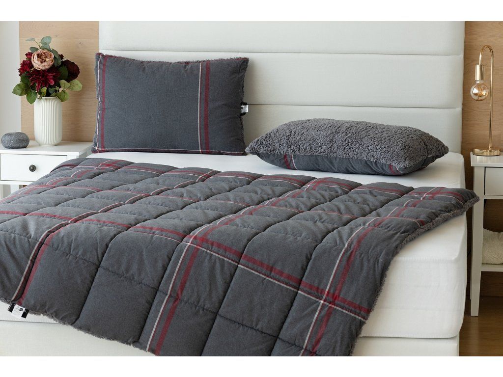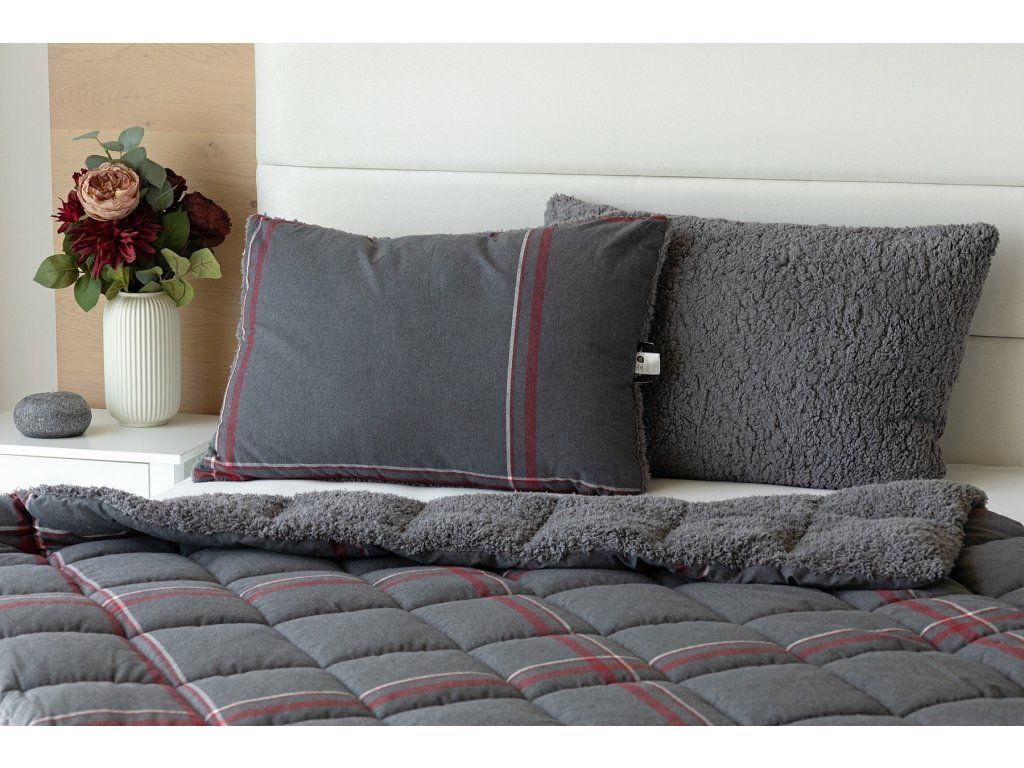 NUR SOLANGE DER VORRAT REICHT! 1x Flanellkissen mit Lamm 50/70 cm, Füllgewicht 800 g, regulärer Preis 690 CZK 1x Flanellsteppdecke mit Lamm 140/200 cm, Grammatur 250 g/m2, regulärer Preis 2.990 CZK Materialzusammensetzung: Oberseite: (Flanell) Mischung aus recycelter Baumwolle und Polyester Unterseite: (Lamm) 100% Polyester Füllung: 100% Polyester Glück begünstigt die Vorbereiteten! Lassen Sie sich nicht vom kalten Wetter überraschen und gönnen Sie sich eine wohlverdiente Erholung in der Wärme... Die neue Kollektion von Flanell-Bettwäsche mit Lamm bietet Ihnen ein einzigartiges Wärmegefühl und unglaublichen Komfort an regnerischen Tagen, kalten Abenden und winterlichen Nächten. Die Oberseite der Bettwäsche besteht aus weichem Flanell mit feiner Flaumstruktur, die Unterseite ist mit warmem, flauschigem Lamm bedeckt. Der attraktive dunkelgraue Hintergrund des Kissens Ida wird von einer weißen und weinrotroten Linie durchzogen, die Unterseite ist mit einem farblich abgestimmten Lamm in dunkelgrau verziert. Steppdecke: Die Innenfüllung besteht aus mikrogelartigem Polyester-Nanofaser, das atmungsaktiv, leicht und nicht verklumpt ist. Die Stabilität der Füllung wird durch präzises Steppen über die gesamte Fläche gewährleistet. Dank der geringen Grammatur können Sie diese praktischen Decken das ganze Jahr über nutzen. In kälteren Zeiten kuscheln Sie sich in das weiche Lamm, das eine ausgezeichnete Wärmeisolierung bietet, in wärmeren Monaten drehen Sie die Decke einfach um. Kissen: Die Innenfüllung besteht aus flauschiger Polyester-Nanofaser, die den Bezug aus Vliesstoff schützt. Der Oberbezug ist abnehmbar und hat einen praktischen Reißverschluss an der Seite. Dank des attraktiven Designs können diese Kissen auch dekorativ eingesetzt werden - es gibt nichts Besseres, als ein Kissen auf dem Sofa zu haben, das gut aussieht und gleichzeitig nützlich ist, wenn plötzliche Müdigkeit eintritt! Pflege: Kissen und Decke können (am besten getrennt) in einer ausreichend großen Waschmaschine bei 40°C gewaschen werden. Bei normaler Verschmutzung kann nur der abnehmbare Bezug des Kissens gewaschen werden. Das Trocknen im Trockner wird definitiv nicht empfohlen, jedoch trocknen die verwendeten Materialien sehr schnell. Die Kollektion von Lamm-Bettwäsche erfüllt die Kriterien der internationalen Zertifizierung Oeko-Tex Standard 100.Zusätzliche Parameter
