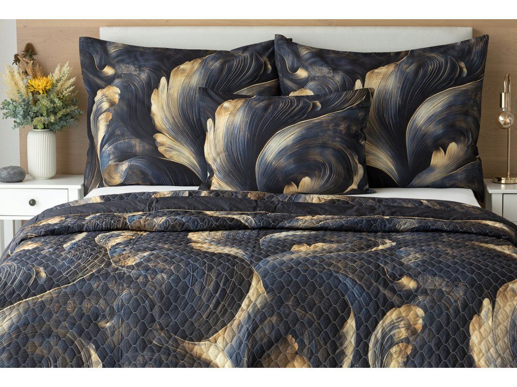 Die Lyra-Bettüberwurf ist eine einzigartige ästhetische und praktische Ergänzung, mit der Ihr Bett immer perfekt gemacht ist. Als Füllung wird mehrschichtiges Hohlfaser mit reduziertem Gewicht verwendet. Das Obermaterial besteht aus 100% Baumwollstoff im gleichen Design wie die Bettwäsche. Über die gesamte Fläche ist eine dekorative Steppung aufgebracht, um die Stabilität der Füllung zu gewährleisten und gleichzeitig das Gesamtbild des Überwurfs zu betonen. Füllgewicht: 120 g/m2 Farbdesign: Abstraktes Lyra-Motiv in einer Palette von dunkelblauen und sandfarbenen Tönen, das auf beiden Seiten des Überwurfs gleich ist. Die Ränder sind mit einer schwarzen Einfassung verziert, die auf der Oberseite mit einer sandfarbenen Paspel ergänzt wird. Pflege: Der Überwurf kann in einer ausreichend großen Waschmaschine bei 40°C gewaschen werdenZusätzliche Parameter