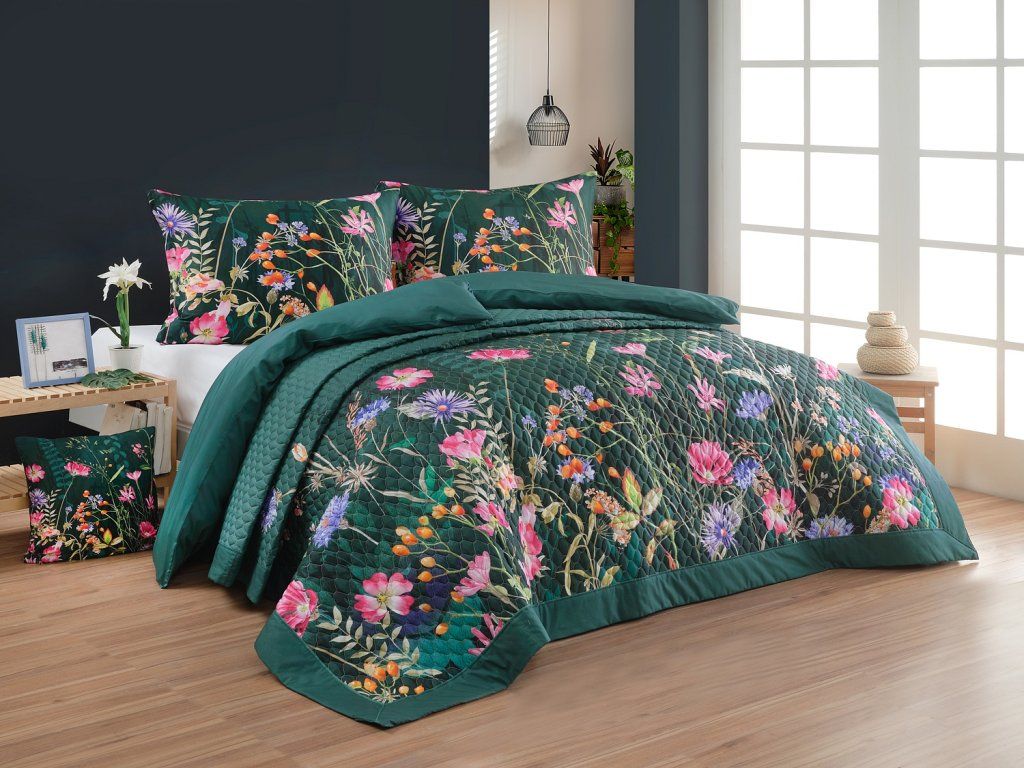Die Margot-Bettüberwurf ist eine einzigartige ästhetische und praktische Ergänzung, mit der Ihr Bett immer perfekt gemacht ist. Als Füllung wird geschichtetes Hohlfaser mit reduzierter Grammatur verwendet. Das Obermaterial besteht aus 100% Baumwollstoff im gleichen Design wie die Bettwäsche. Über die gesamte Fläche ist eine dekorative Steppung aufgebracht, um die Stabilität der Füllung zu gewährleisten und gleichzeitig das Gesamtbild des Überwurfs zu betonen. Füllgewicht: 120 g/m2 Farbdesign: Attraktives Motiv bunter Blumen auf einem grünblauen Hintergrund, der auf beiden Seiten des Überwurfs gleich ist. Die Ränder sind mit grünblauer Einfassung verziert, ergänzt auf der Oberseite durch gedämpfte grünblaue Paspel. Pflege: Die Überwürfe können in einer ausreichend großen Waschmaschine bei 40°C gewaschen werdenZusätzliche Parameter
